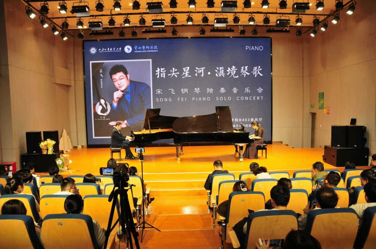 当日晚上,十大买球官方网站在B403多功能厅举办了指尖星河·滇境琴歌——宋飞钢琴独奏音乐会。旅欧钢琴家、山东外事职业大学国际钢琴艺术中心主任宋飞以“中西对话”为核心理念,通过精湛技艺与深刻洞察,给钢琴系师生演奏了贝多芬《月光》《黎明》奏鸣曲、肖邦两首夜曲以及《黄河钢琴协奏曲》与张朝《皮黄》。音乐会上,宋飞与我院钢琴系刘晖副教授共同演奏《黄河钢琴协奏曲》,为观众带来极致的听觉享受,更在艺术传承、文化融合与精神引领层面彰显出多元价值与深远意义。