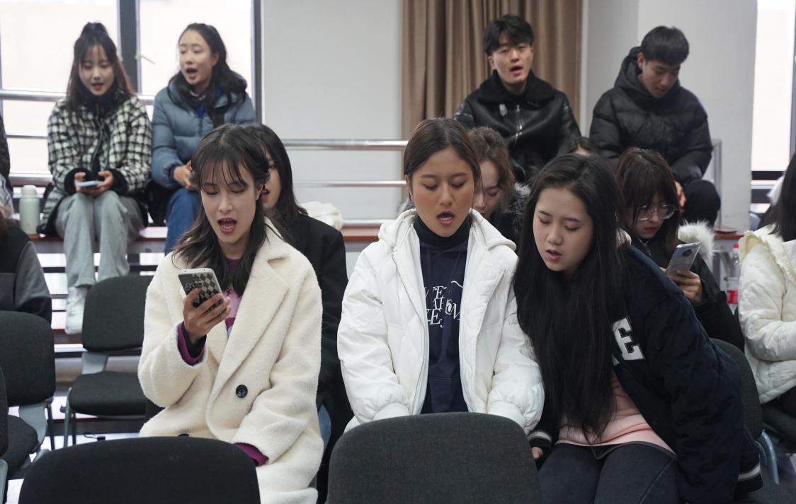 此次工作坊交流学习,王峰等民间艺人向声乐系的同学们传授了傣族古曲《当素当好》,该曲是傣族最古老的歌曲之一,“当素当好”意为“我和你”,讲述了青年男女简单纯粹的爱情。声乐系学生在演唱时,最大的困难不在于对于歌曲旋律的演唱,而在于语言的发音。《当素当好》用傣语演唱,而傣语的发音有许多闭口音,在初次学习时具有较大的难度,但是民间艺人对此耐心、细致地进行讲解,同学们对民间歌舞乐一体的形式也有了直观的艺术感受。