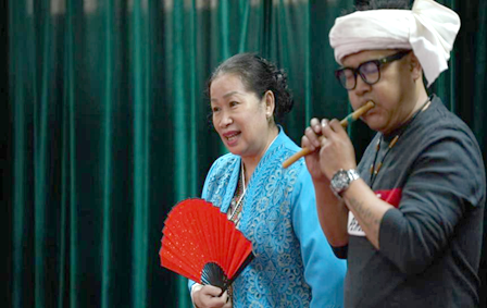 22日上午,来自西双版纳歌舞团的艺术家玉旺囡、岩健,向云艺师生们展示了傣族民间曲艺——赞哈。