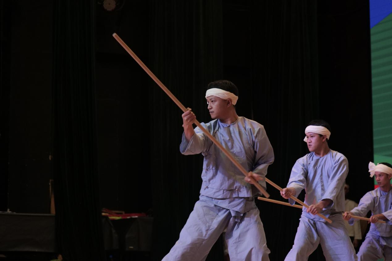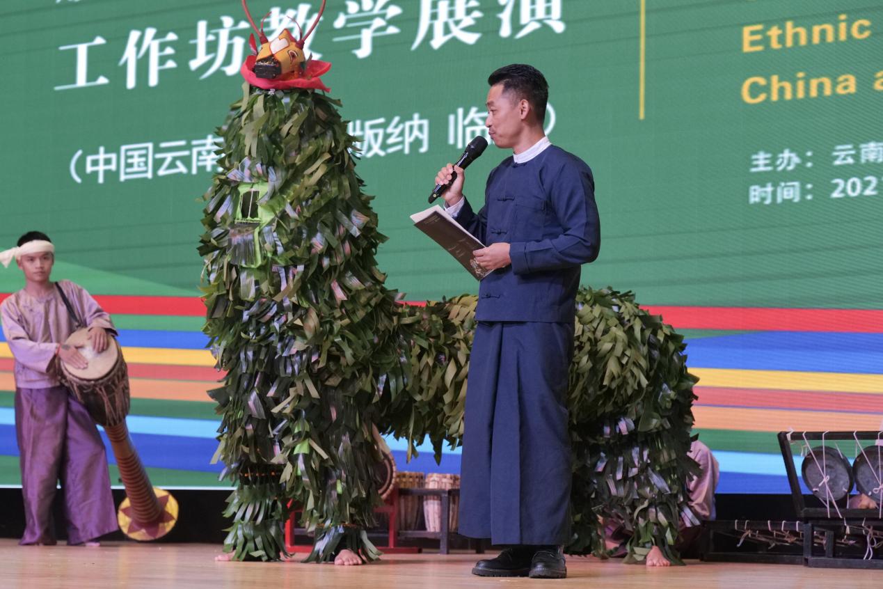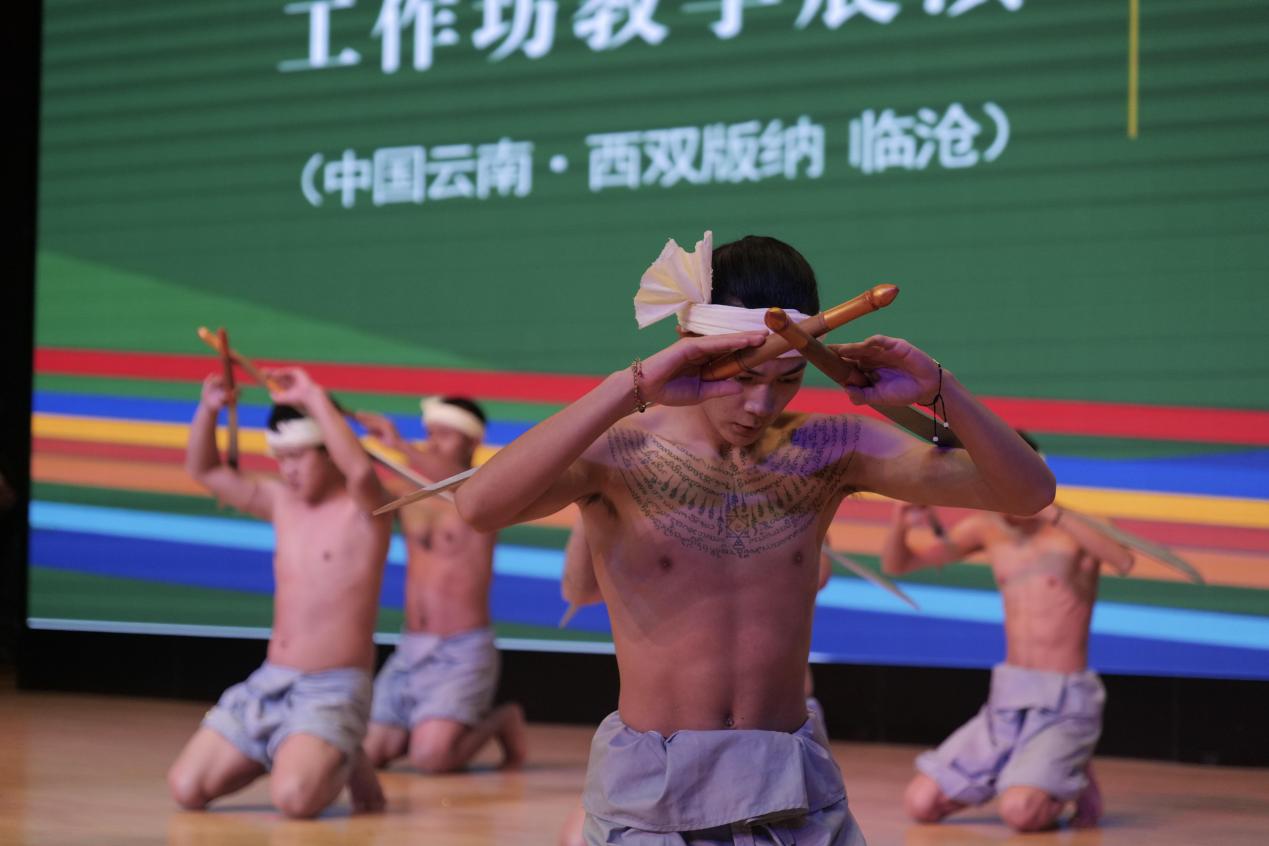 第二项活动由临沧地区耿马县文化馆/民族文化工作队(文艺演出团队)与我校十大买球官方网站、舞蹈学院学生共同表演,由王峰主持。首先是傣族古乐舞,由演出团队成员安芒、俸玉款、李学琴、普丽花等人进行乐舞表演,由能底、岩细、俸文杰进行器乐伴奏。第二个节目耿马傣族鼓语由李波、岩依、岩平、依帐等人共同表演,主持人王峰简要介绍耿马傣族及其使用的三种傣文、乐器,以及耿马音乐舞蹈,充分展示当地傣族文化的丰富多彩。演出活动中,耿马傣族同胞向现场观众介绍神兽之舞,并教授象脚鼓鼓语,全场观众热情回应,争先恐后回答问题,全场气氛热烈,满堂欢声笑语。紧接着,由俸小美、叶弄、尹夜、砍润、刀永新等团队成员先后带来蝴蝶舞、紧那罗、傣族传统武术,现场掌声雷鸣。最后,由李志明、相农、引少等成员为观众带来原创舞蹈节目“舞刀少年”“南西米”“马鹿舞”。表演嘉宾与云艺学子们共同呈现了一场精彩纷呈的演出,现场高潮迭起,掌声经久不息。教学展演在快乐与期许中落下帷幕,民族音乐文化所带来的震撼深深烙印在每位观看演出的人心中。