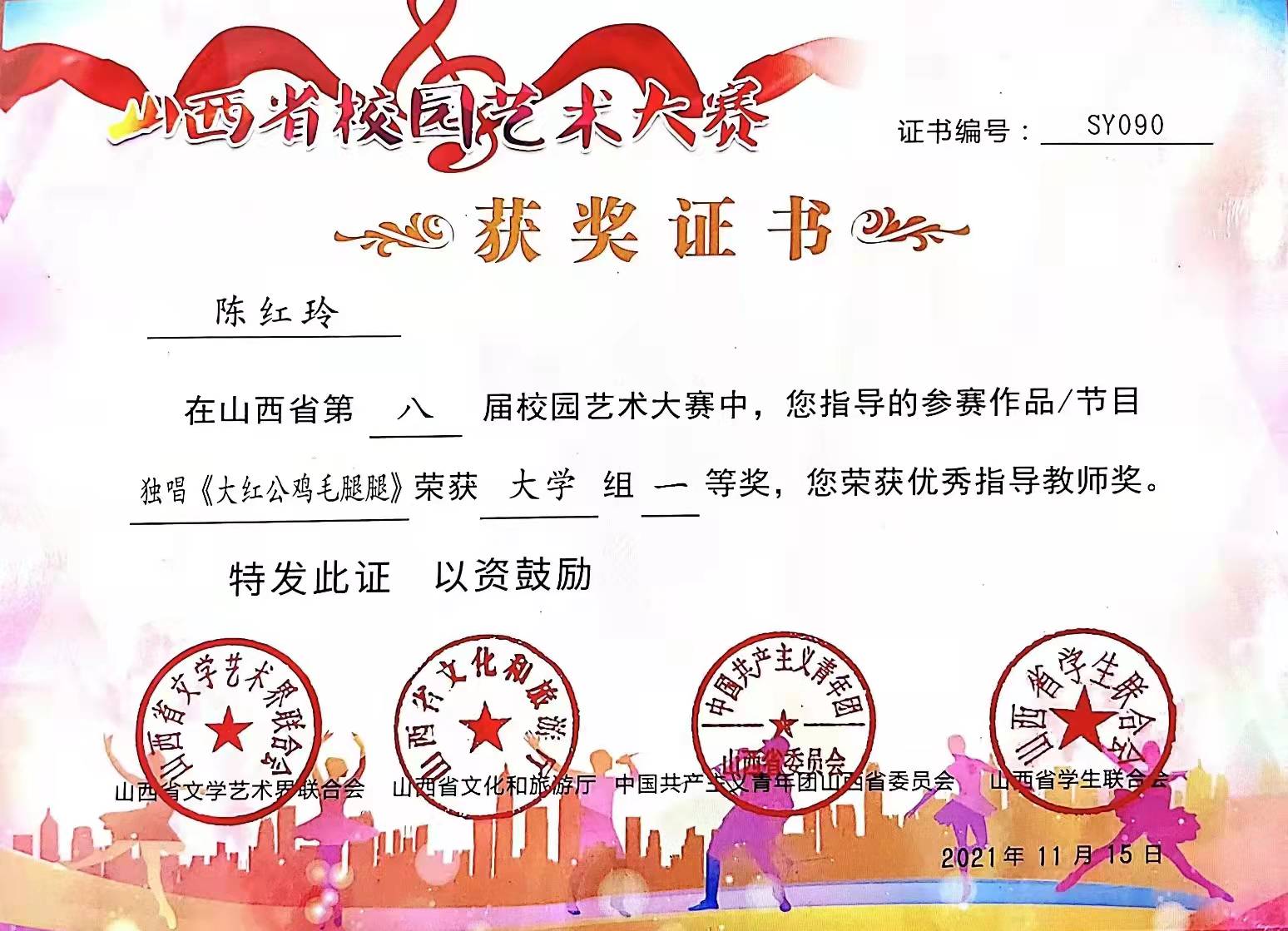 在庆祝中国共产党成立100周年之际,山西省文学艺术界联合会、山西省文化和旅游厅、共青团山西省委、山西省学生联合会于2021年4月至11月联合举办“第八届山西省校园艺术大赛”, 民族声乐系系主任陈红玲教授荣获“优秀指导教师奖”,民族声乐系学生郝一阳荣获大学生组独唱“一等奖”。