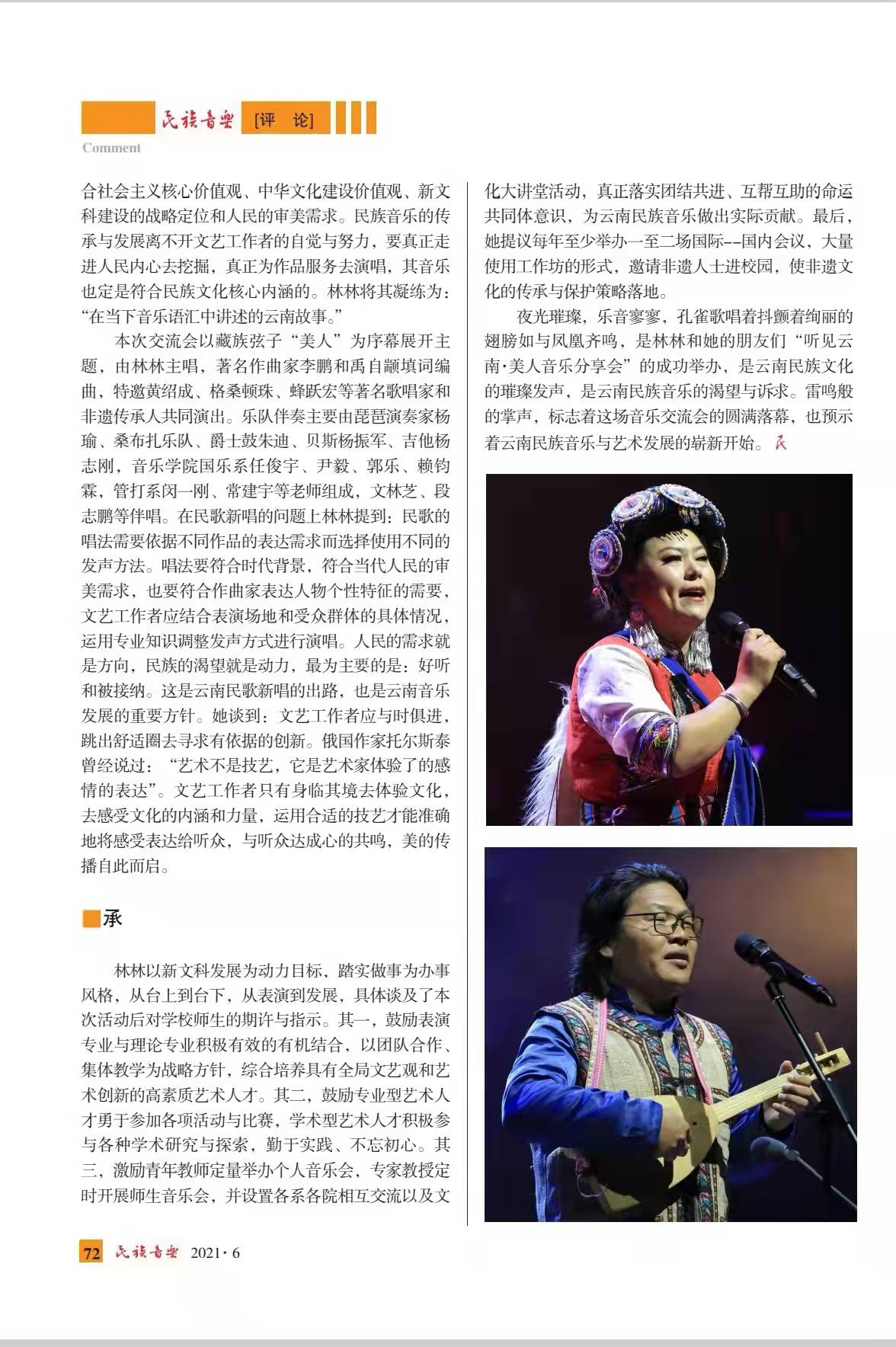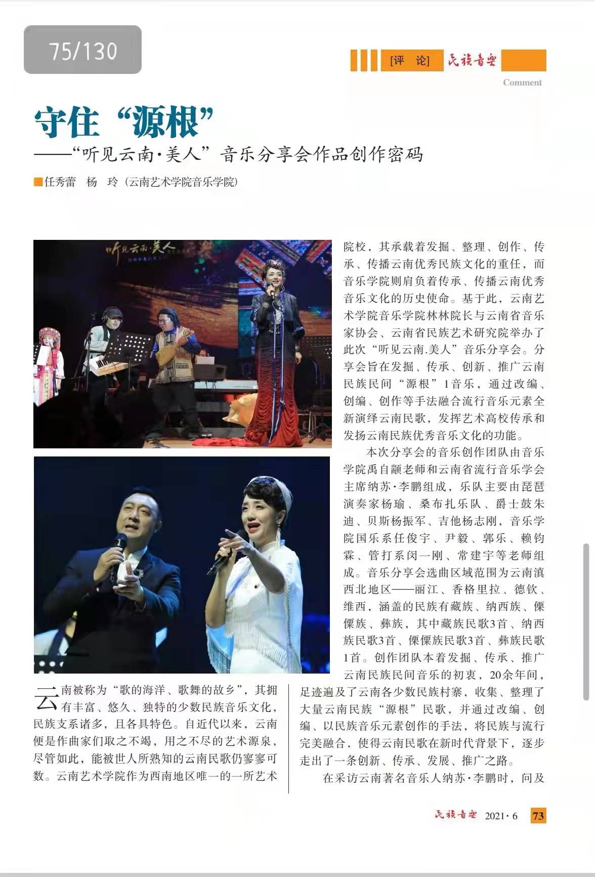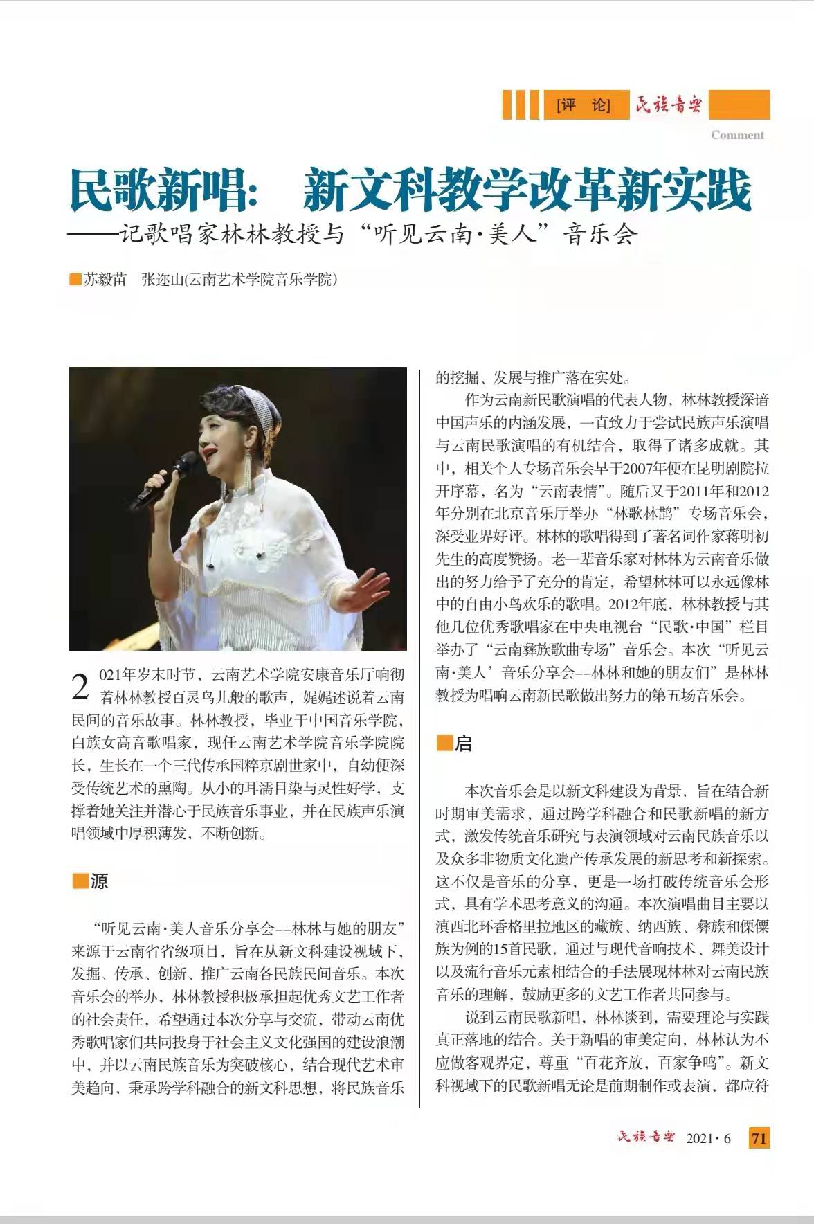 《民歌新唱:新文科教学改革新实践——记歌唱家林林教授与“听见云南·美人”音乐会》 《守住“源根”——“听见云南·美人 ”音乐分享会作品创作密码》刊登于《民族音乐》2021年第6期。