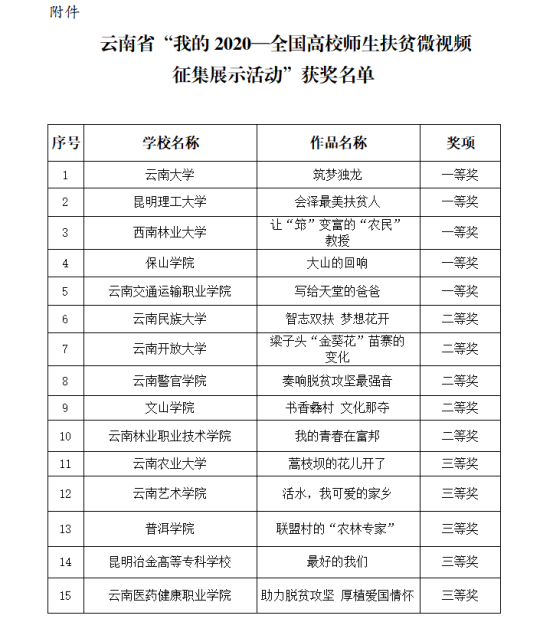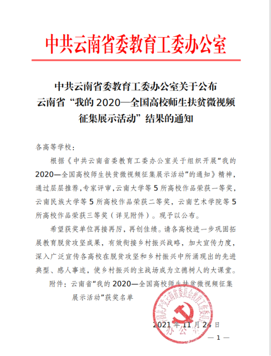 十大买球官方网站民族声乐系系主任陈红玲教授的作品《活水,我可爱的家乡》在云南省委教育工委组织的“我的2020全国高校师生扶贫微视频征集展示活动”中荣获三等奖。
