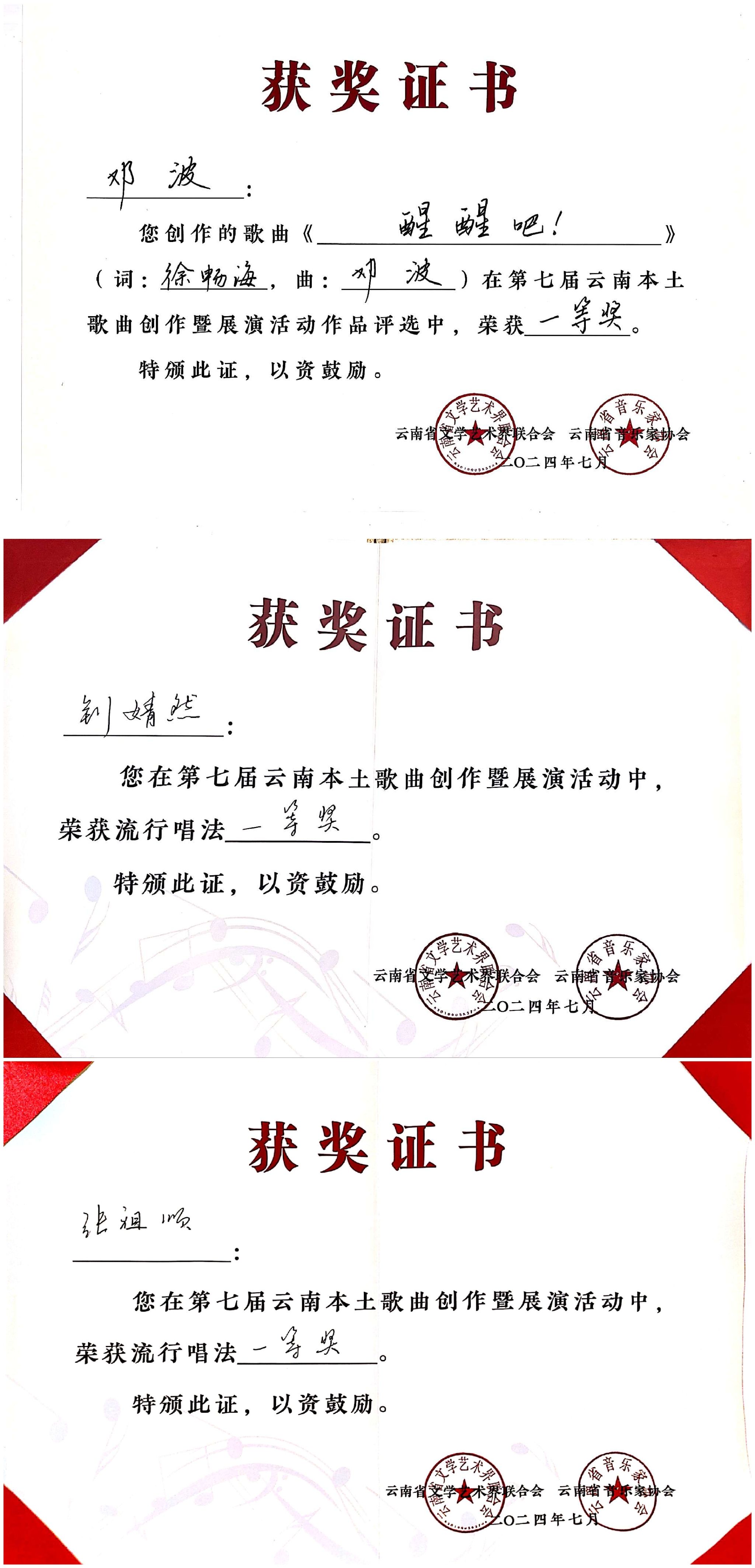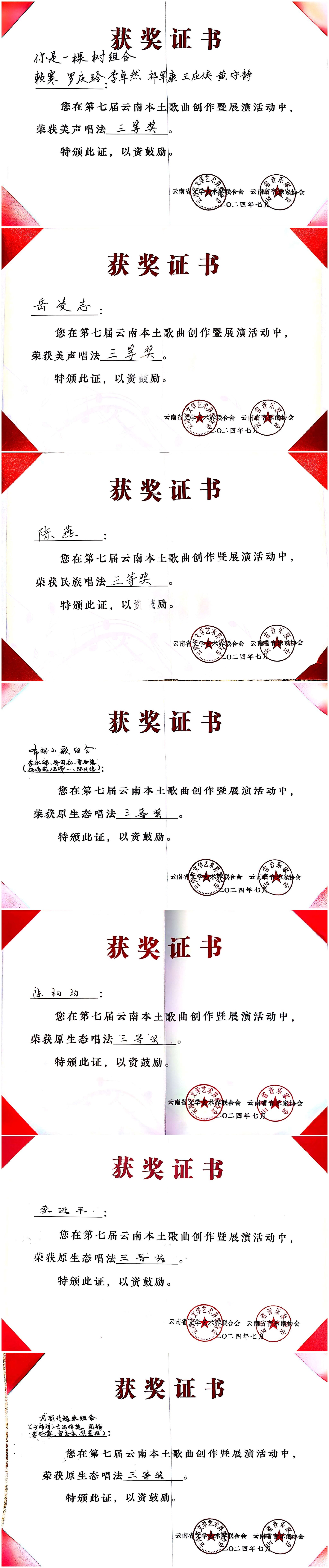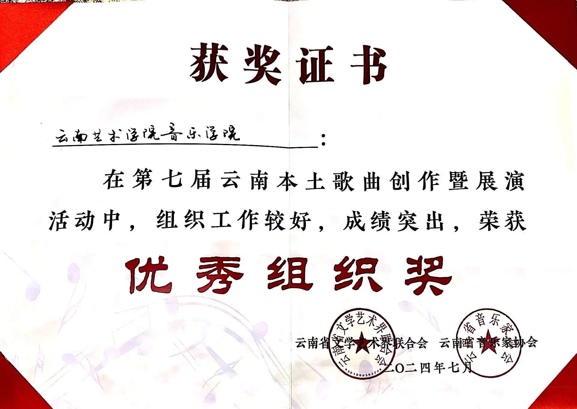 2024年7月23日至27日,由云南省文学艺术界联合会、中共玉溪市委宣传部主办,云南省音乐家协会、玉溪市聂耳文化中心、玉溪市文学艺术界联合会承办的第七届云南本土歌曲创作暨展演活动在玉溪举办。十大买球官方网站师生在作品类、演唱类(民族、美声、流行、原生态4个组别)两个类别中获3个一等奖、2个二等奖、7个三等奖、10个优秀奖,十大买球官方网站获优秀组织奖。