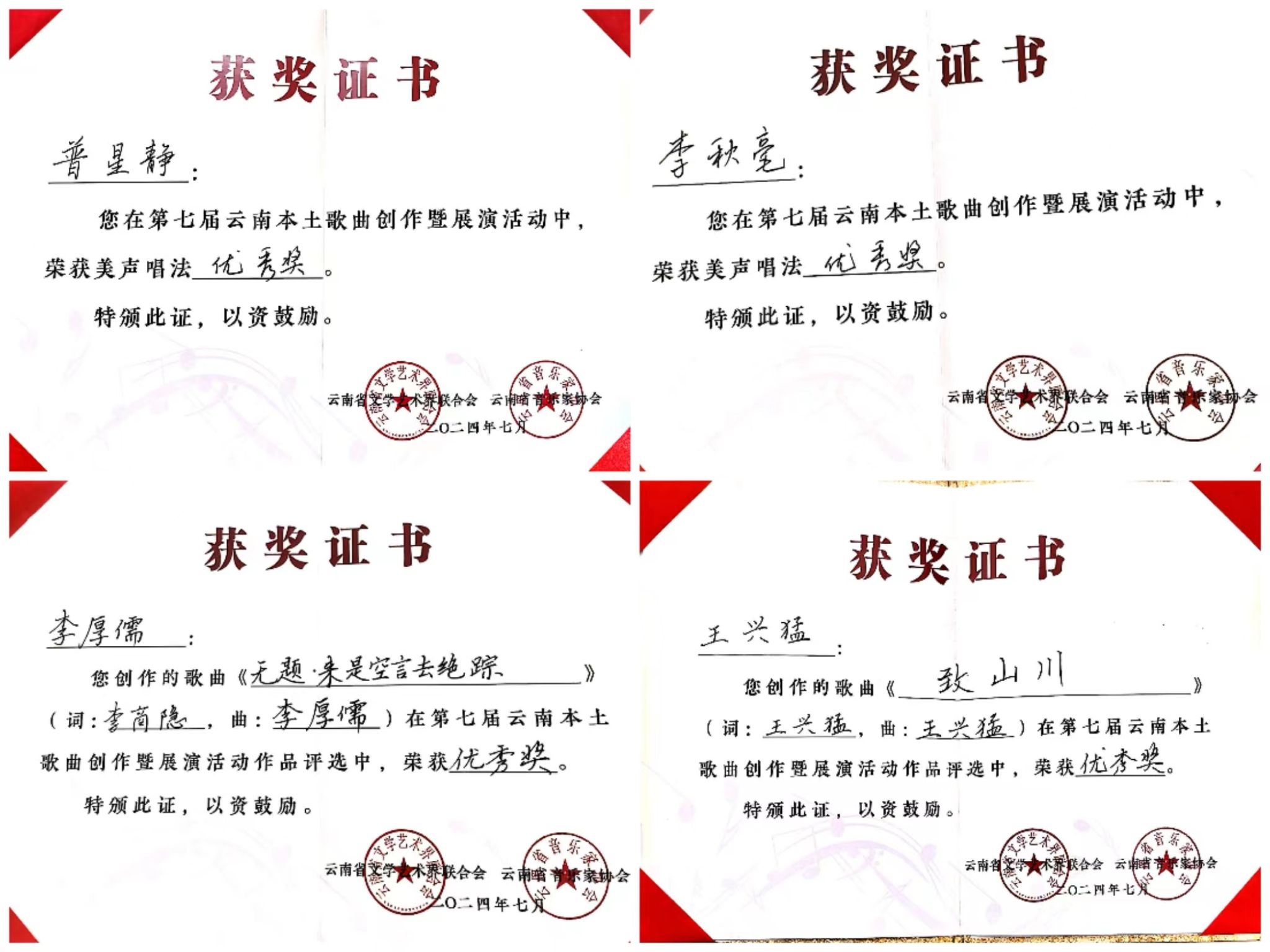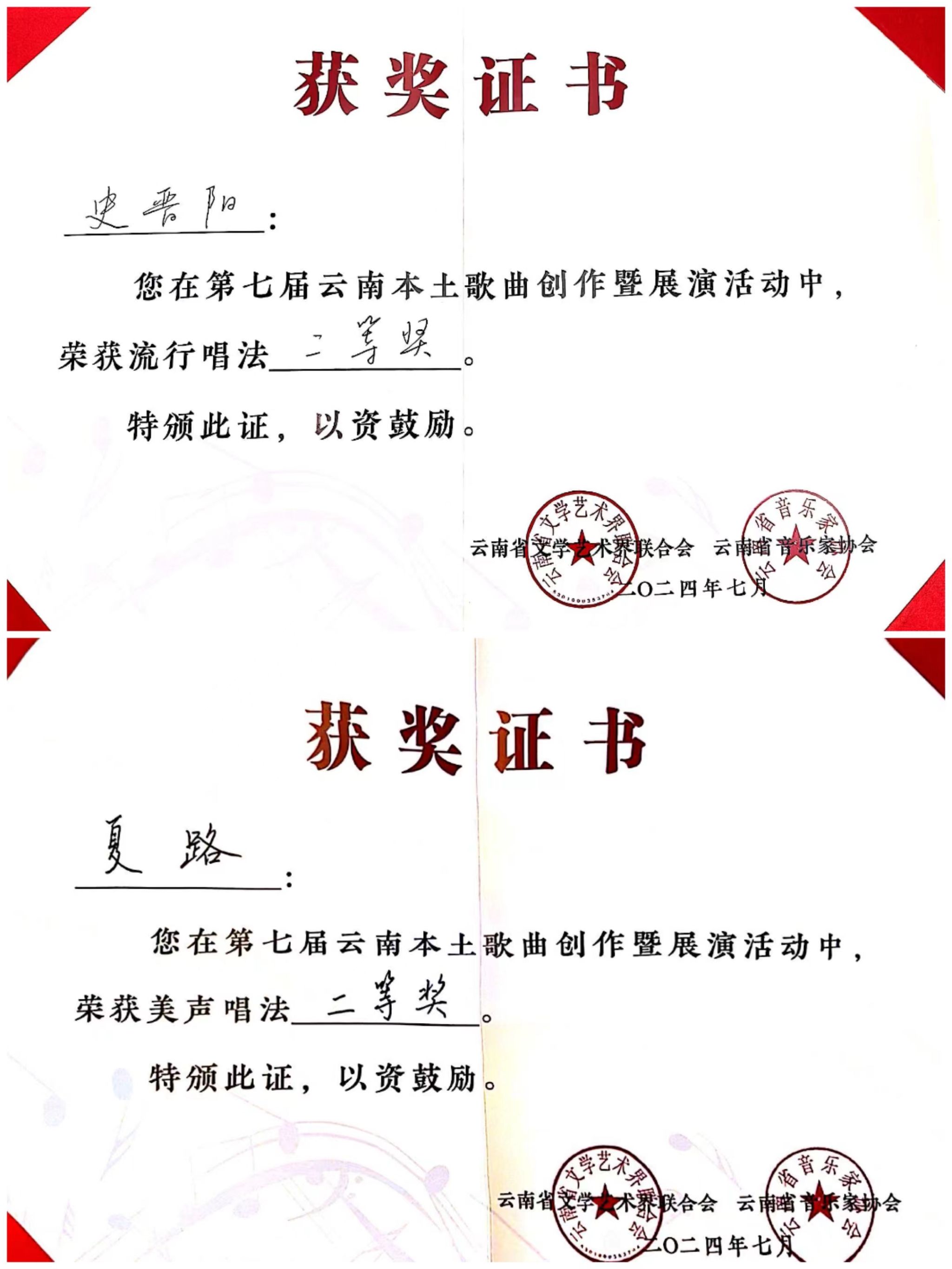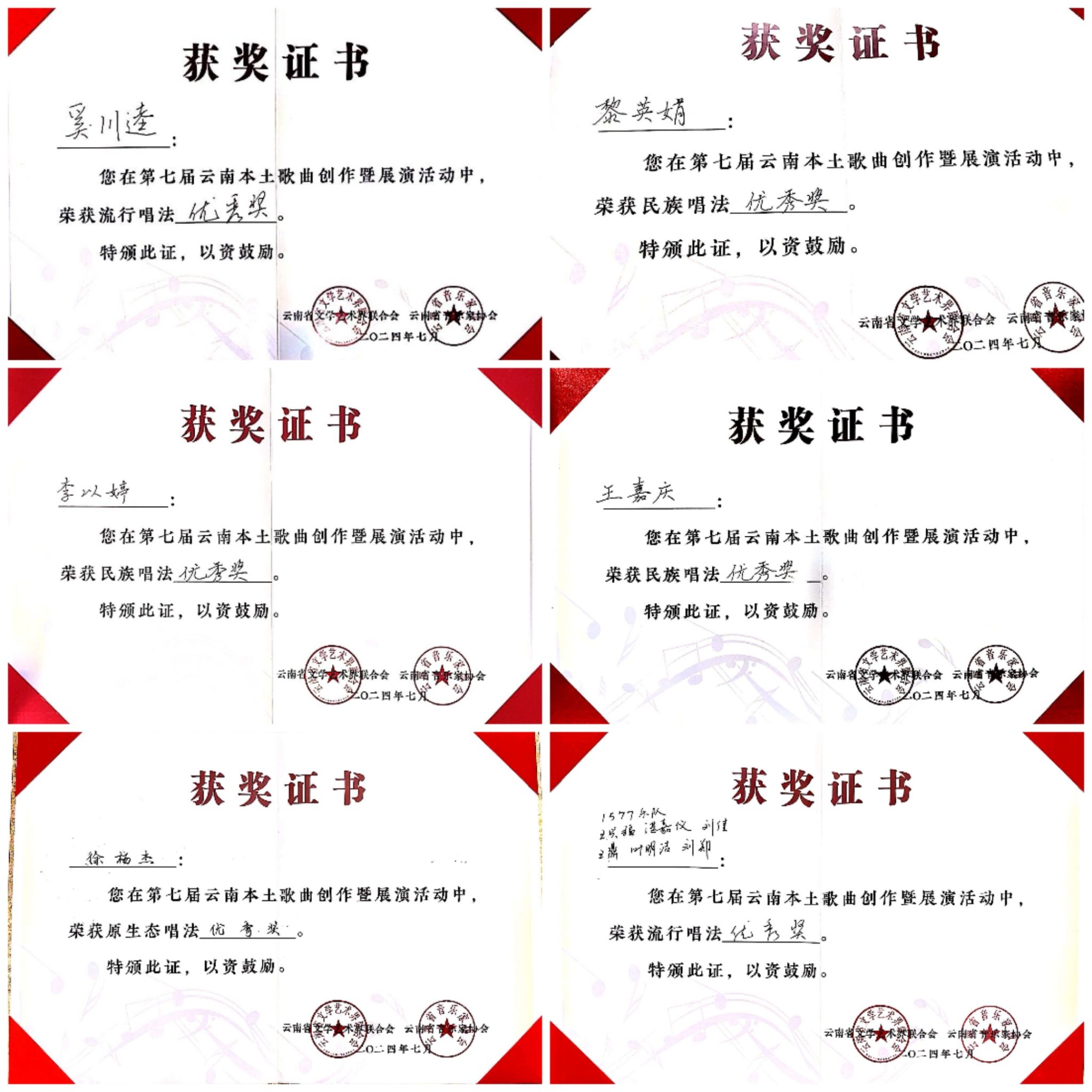 2024年7月23日至27日,由云南省文学艺术界联合会、中共玉溪市委宣传部主办,云南省音乐家协会、玉溪市聂耳文化中心、玉溪市文学艺术界联合会承办的第七届云南本土歌曲创作暨展演活动在玉溪举办。十大买球官方网站师生在作品类、演唱类(民族、美声、流行、原生态4个组别)两个类别中获3个一等奖、2个二等奖、7个三等奖、10个优秀奖,十大买球官方网站获优秀组织奖。