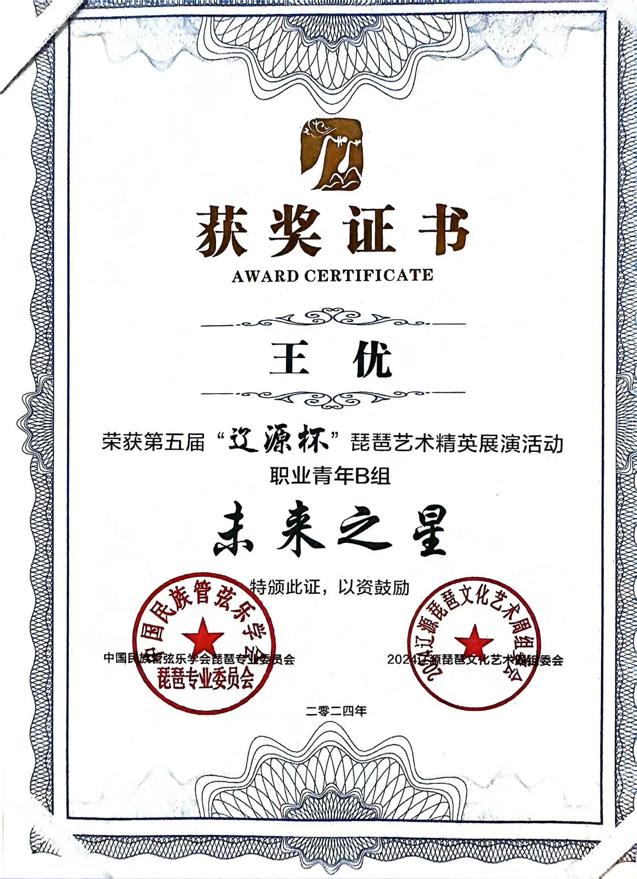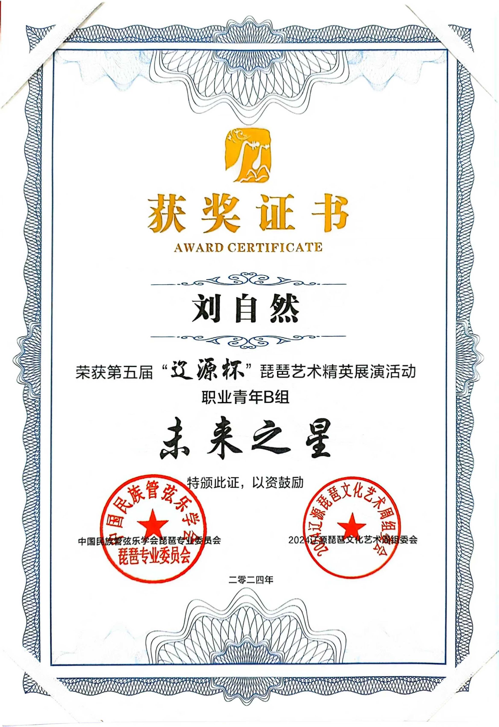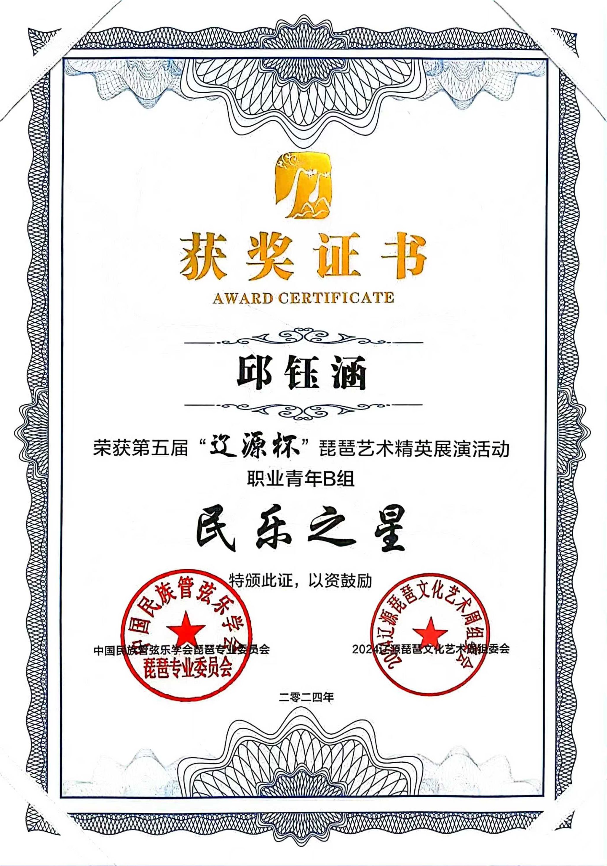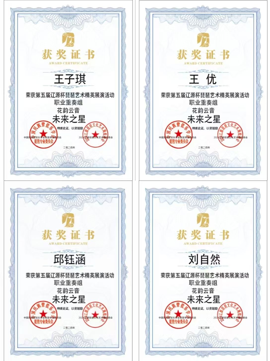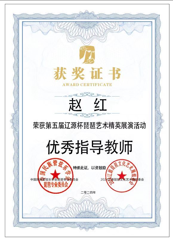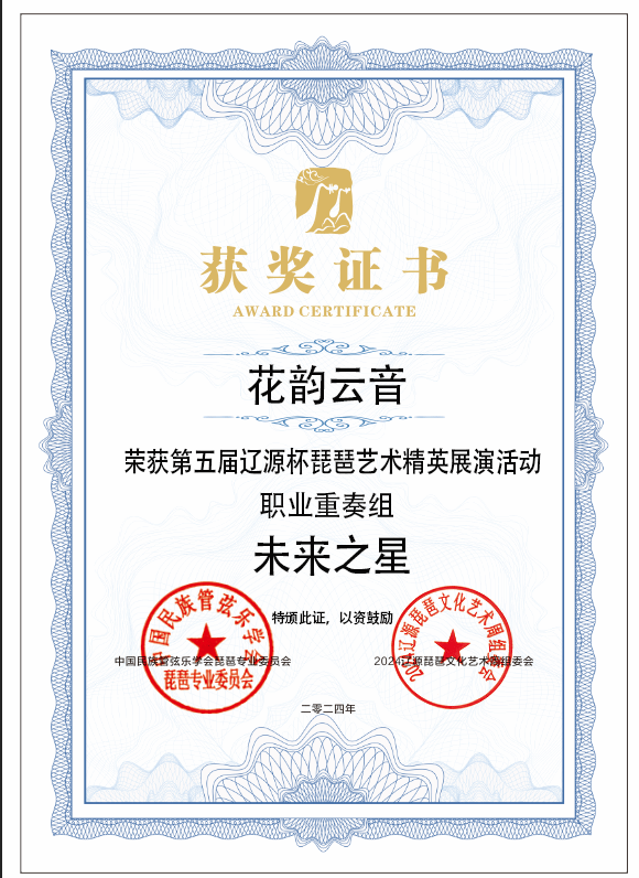 2024年8月1日至5日,由中共辽源市委、辽源市人民政府、中国民族管弦乐学会琵琶专业委员会、吉林省民族管弦乐学会主办的第五届“辽源杯”琵琶艺术精英展演活动在吉林省辽源市举行。十大买球官方网站研究生班王子琪获职业成年组“民乐之星”,2023级国乐班邱钰涵获职业青年B组“民乐之星”,2020级国乐班王优、2023级国乐班刘自然分别获职业青年B组“未来之星”,由王子琪、王优、邱钰涵、刘自然组成的“花韵云音”获职业重奏组“未来之星”。国乐系教师赵红获“优秀指导教师”。