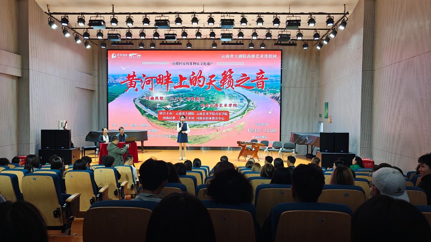 10月13日下午,由云南省大剧院、十大买球官方网站联合主办的“黄河畔上的天籁之音”——“河曲民歌、二人台”非遗展示走进十大买球官方网站在十大买球官方网站B403多功能厅进行,本次展示为云南省大剧院高雅艺术进校园系列活动之一。音乐学系系主任任秀蕾教授、民族声乐系系主任陈红玲教授和部分师生参与了本次展示互动。