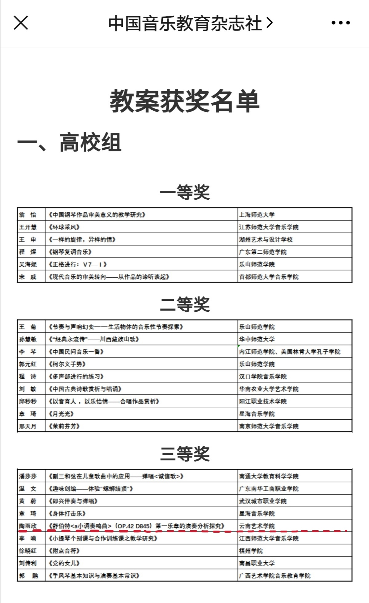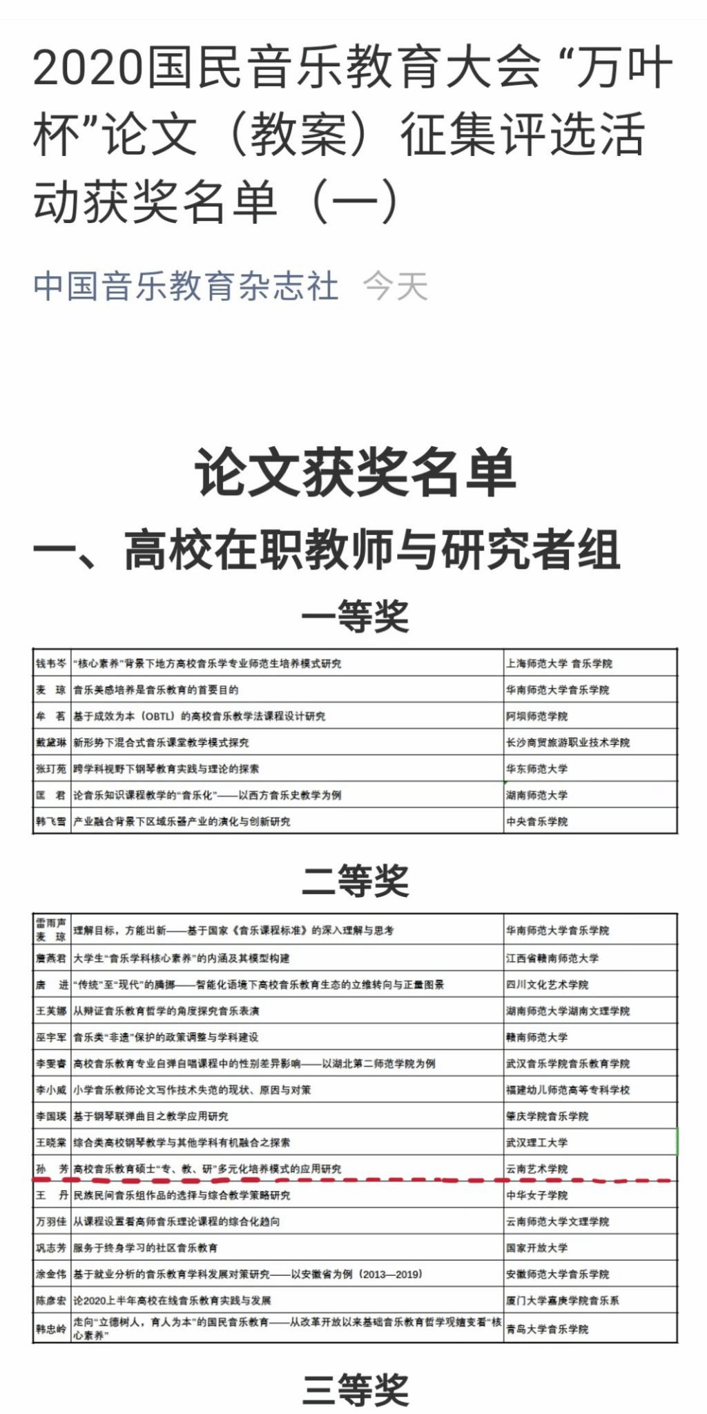 2020年国民音乐教育大会于10月29日在上海新国际博览中心开幕,十大买球官方网站音乐教育系师生代表参加了此次盛会,与全国音乐教育专家学者进行学术探讨和交流。在此次大会中,由中央十大买球官方网站、中国乐器协会、《中国音乐教育》杂志社、全国音乐教育联盟等联合主办的“万叶杯”论文(教案)评选,全国二百多所院校师生提交1800多篇论文参评,是近年来中国规模最大的音乐教育论文评奖。经过音乐教育权威专家组的层层选拔,仅有30余位教师及学生获得奖项。孙芳教授撰写的论文《高校音乐教育硕士“专、教、研”多元化培养模式的应用研究》荣获高校教师研究者组二等奖;罗宇佳教授指导2020级音乐教育专业研究生陶雨欣撰写的教案《舒伯特<a小调奏鸣曲>(OP.42 D845)第一乐章的演奏分析探究 》荣获高校教案组三等奖。