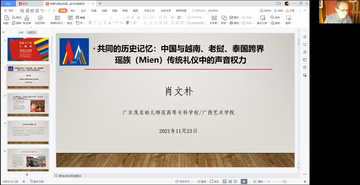 广东茂名幼儿师范高等专科学校/广西艺术学院肖文扑在题为《共同的历史记忆:中国与越南、老挝、泰国跨界瑶族(Mien)传统礼仪中的声音权利》发言中,介绍了瑶族的历史可以形象地缩减成四个字:迁徙之路。在漫长的族群迁徙历程中必定会发生诸多的重大历史事件而留下印记,如:战争、灾难等,但从其传统礼仪的种种行为考察,回归美丽、富足、安定的精神家园---祖居地才是瑶人最核心的“共同的历史记忆”。