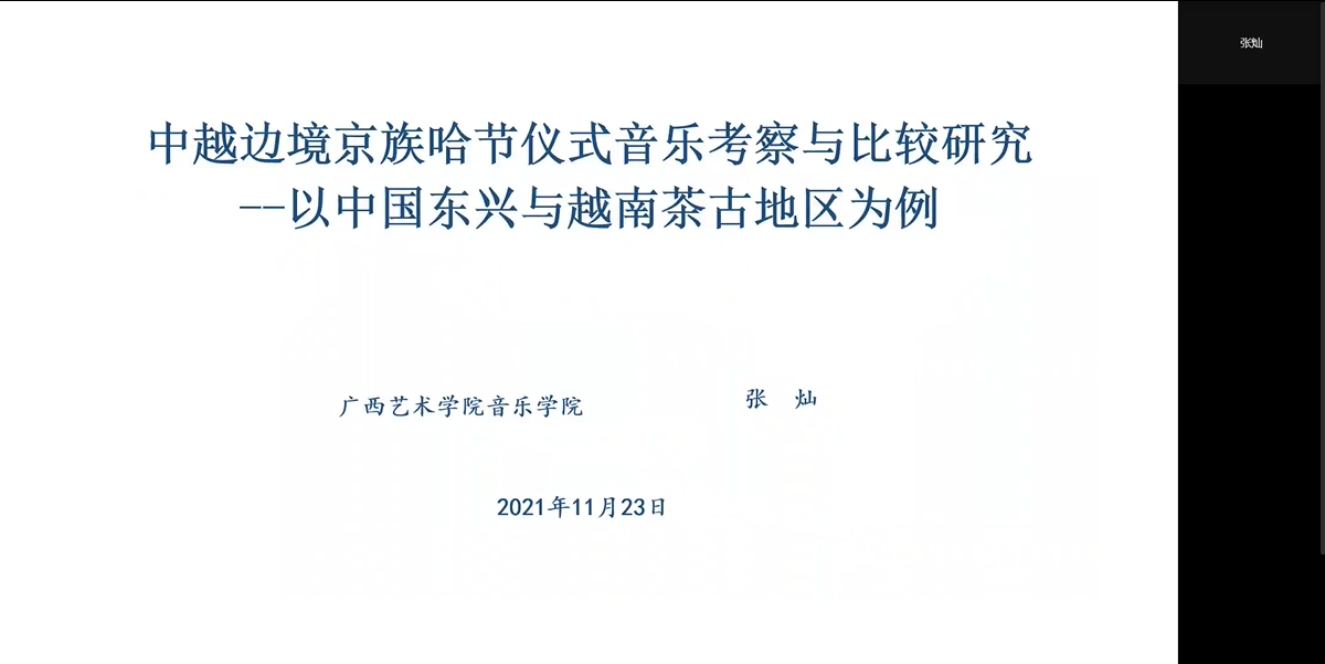 广西艺术学院张灿 在《中越边境京族哈节仪式音乐考察与比较研究--以中国东兴与越南茶古地区为例》发言,认为中国与越南两国山水相连,陆地的边境地区存在着丰富多样的跨国界文化现象,其根本原因在于中越两国存在着数量较多的跨境民族。