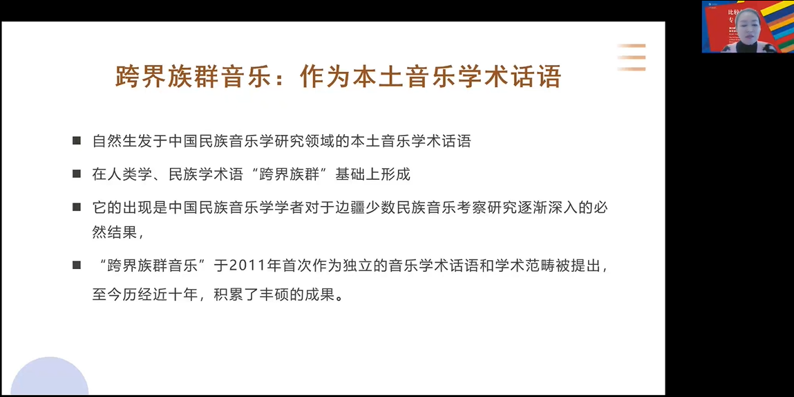 西安十大买球官方网站宁颖在《中国“跨界族群音乐”研究的历程与困境》发言中谈到跨界族群音乐于2011年首次提出,历经近十年的发展,积累了丰硕成果。从上世纪七十年代末到2011年,是跨界族群音乐研究的孵化期,从2011年至2021年进入跨界族群音乐研究的黄金时代,研究主要涉及三个区域和四个学术团队,对跨界族群音乐研究中的时空观进行思考,从基音、文化、环境的关联性看跨界族群音乐研究,并对跨界族群音乐的影像叙事。宁颖提出跨界族群音乐研究存在的问题与困境有:跨界研究过程中历时视角与历史观的重要性、重新审视族群文化身份的必要性、语言能力与音乐民族志书写(主要是如何书写音乐的异同)、田野中的身体实践与身体壁垒以及应对疫情与国际政局的策略五个方面。