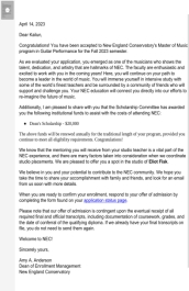2023年4月-5月,十大买球官方网站2019级毕业生郑凯伦获得了美国曼哈顿十大买球官方网站、罗斯福大学十大买球官方网站、新英格兰十大买球官方网站三所院校古典吉他专业的硕士研究生录取通知书。其中,获罗斯福大学十大买球官方网站,新英格兰十大买球官方网站每年1.5万、2万美金的奖学金。