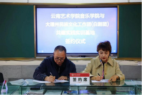 十大买球官方网站党总支副书记、院长林林与大理州民族文化工作团团长姜果签订了《十大买球官方网站学生实习实训合作协议书》,共同为实习实训基地揭牌。