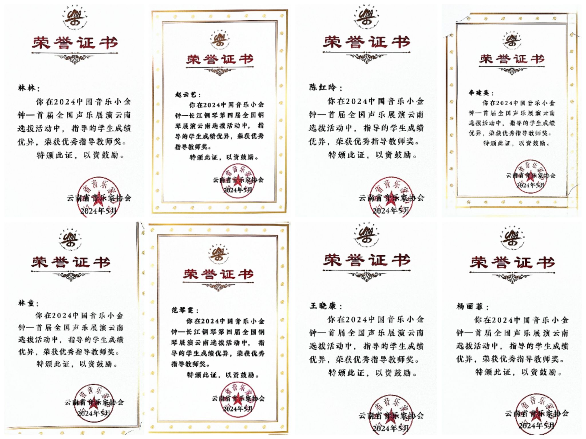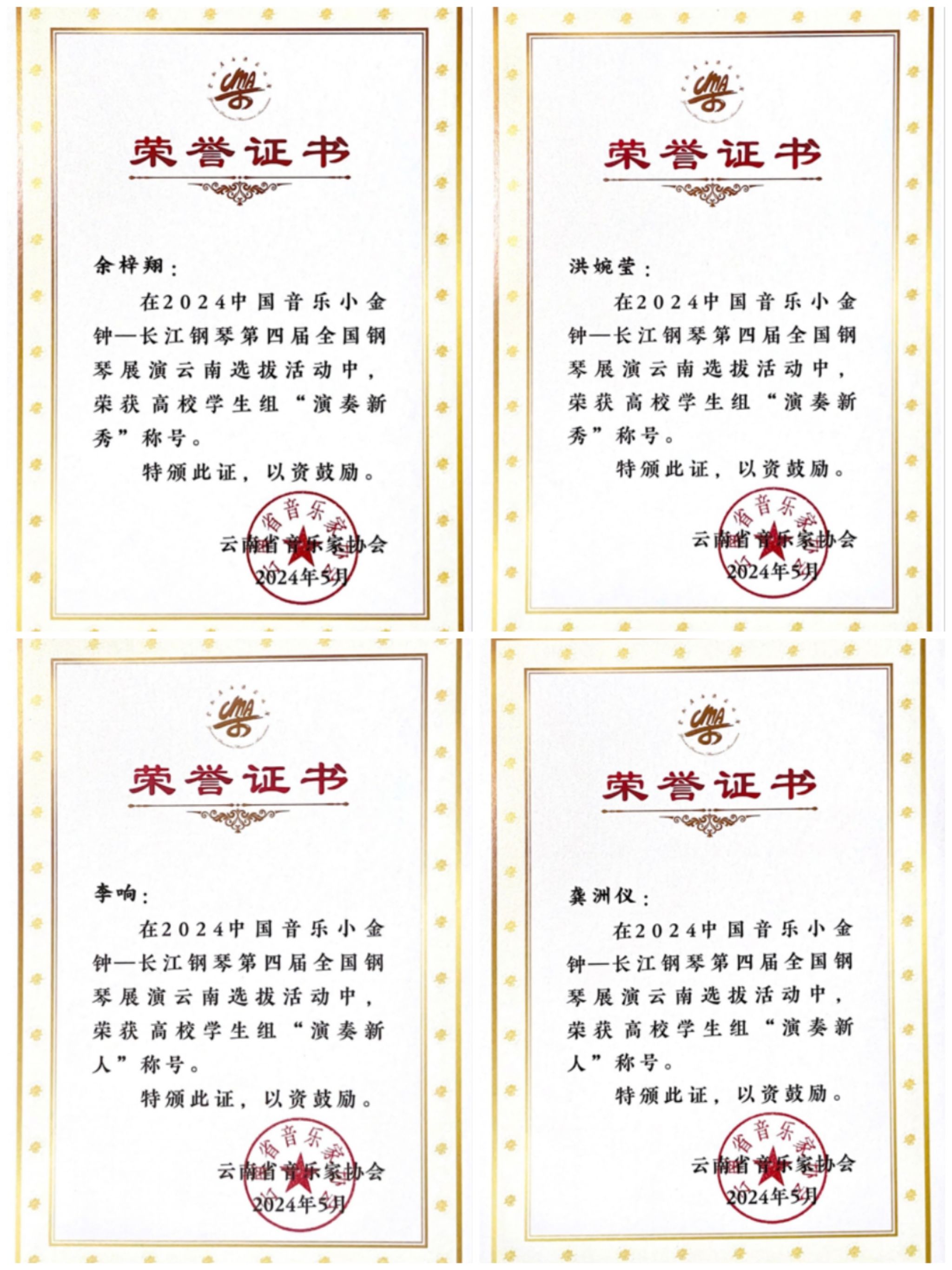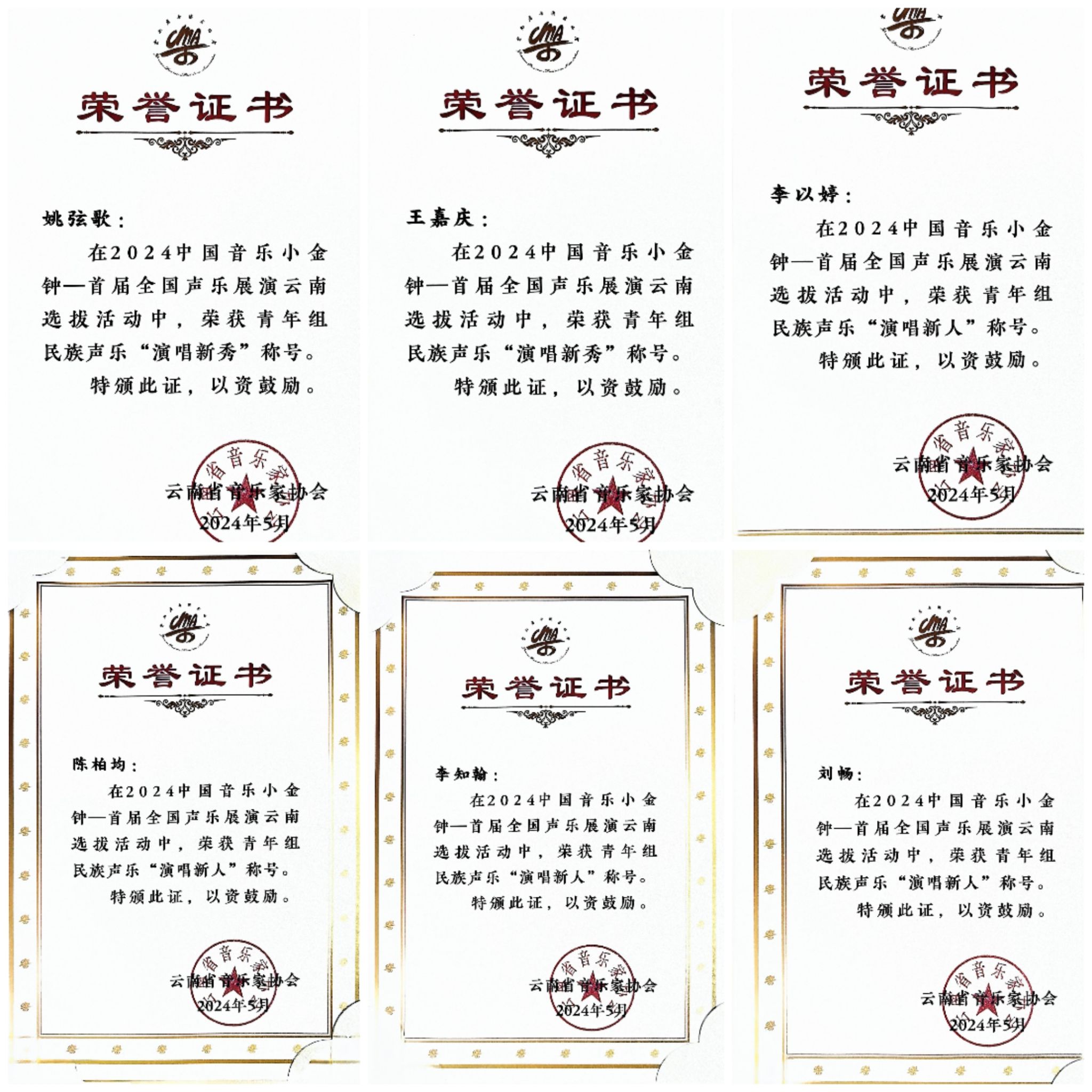 2024年4月27日至28日,由云南省音乐家协会主办的2024中国音乐小金钟——“长江钢琴第四届全国钢琴展演云南选拔活动”和“首届全国声乐展演云南选拔活动”在云南文学艺术馆举办。本次比赛汇集了云南各高校、省级文艺团体以及各地州音乐家协会推选的优秀选手,经过初赛、复赛、总决赛,十大买球官方网站共4名学生斩获“演奏新秀”“演奏新人”称号,10名学生斩获“演唱新秀”“演唱新人”称号,8名教师获优秀指导教师。