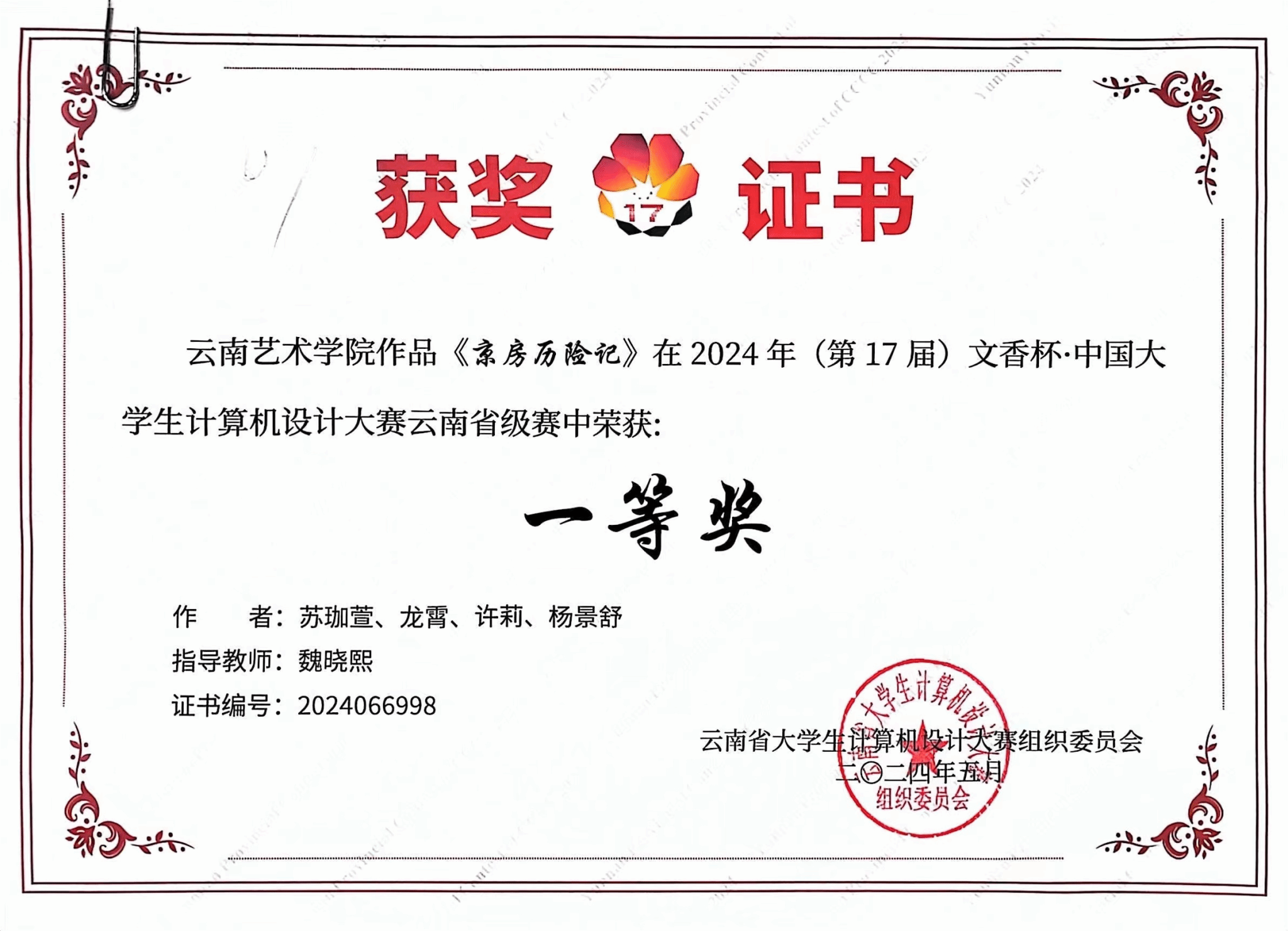 一等奖获奖作品分别为:《九章虔响》负责人邓茗,组员曾弈鑫、李海龙、马赵懿、刘家森,指导教师田建华、高弘扬;《京房历险记》负责人苏珈萱,组员龙霄、许莉、杨景舒,指导教师魏晓熙。二等奖获奖作品为《德卿手记》,负责人李馨怡,组员黄卓冉、黄彰杰、蒋颜玉,指导教师田建华。