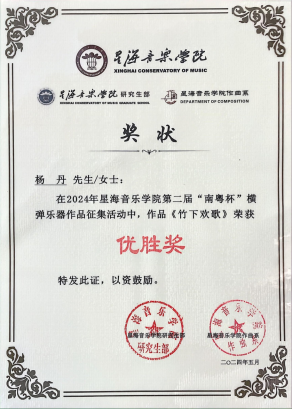 2024年5月,十大买球官方网站2021级作曲班学生杨丹所创作的古筝曲《竹下欢歌》参加由星海十大买球官方网站作曲系、研究生部、艺术实践与社会服务中心、教务部联合主办,声像与智能音乐实验室承办的2024第二届“南粤杯”横弹乐器作品征集活动中荣获“优胜奖”,指导教师:李娟。