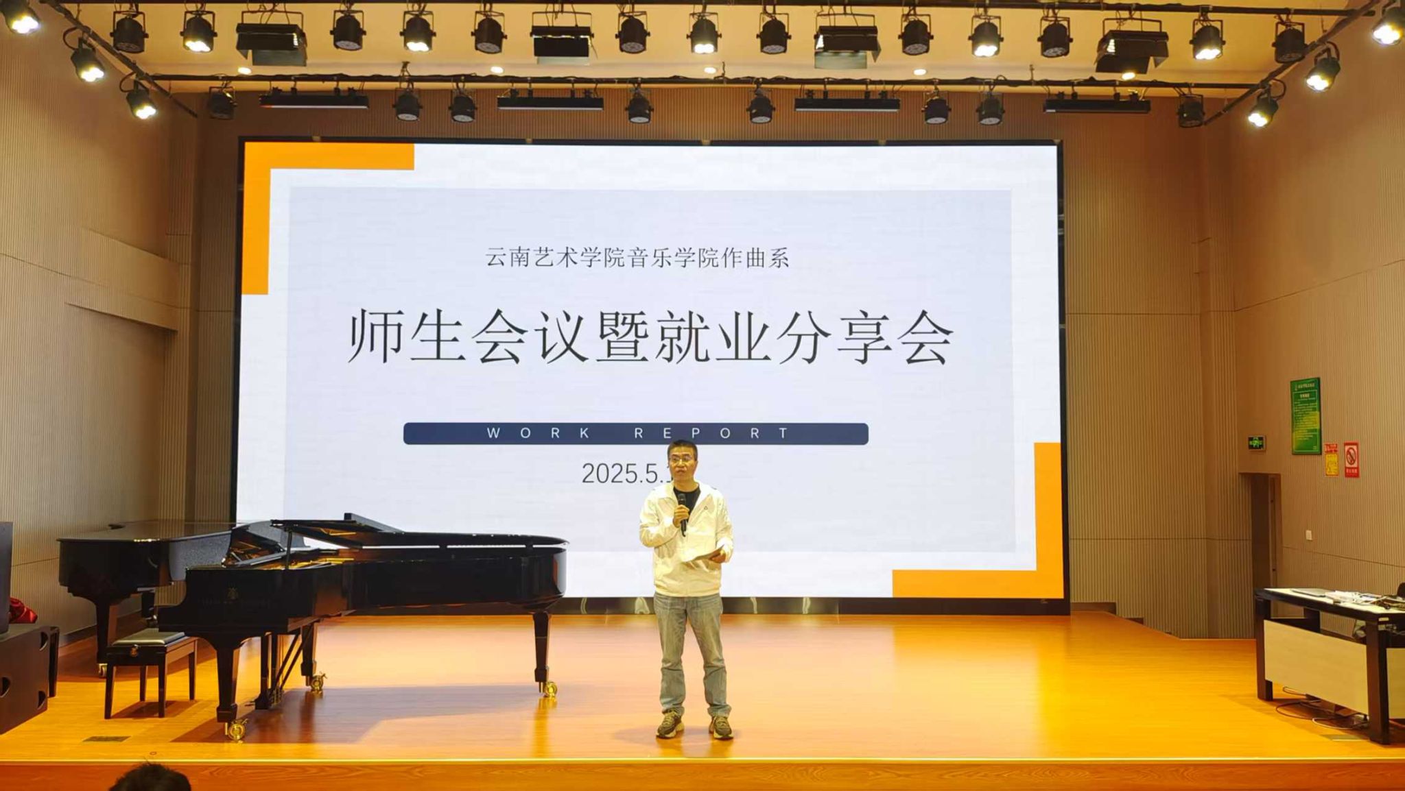 2025年5月15日下午,作曲系组织全体师生在B403召开师生会议暨2025届毕业生就业分享会,系主任田建华老师主持会议。