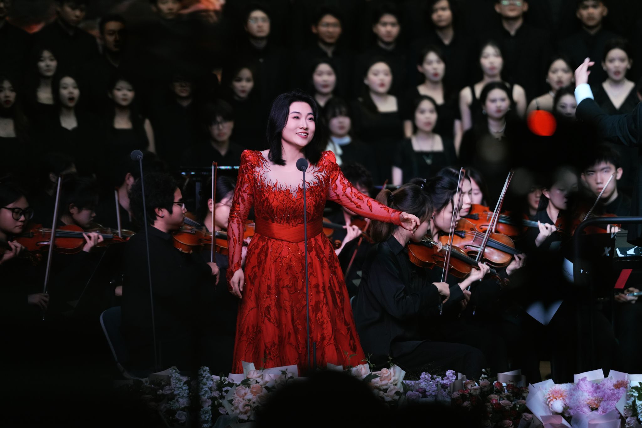 下半场,由合唱系教师张红彬以极具感染力的指挥风范,携手合唱系、民族声乐系、声乐歌剧系的尹伟、杨丽霞、刘英梓、李婷婷、罗聪鹏、杨扩以及薛文静共7位教师实力领唱,用歌声深情诉说长征故事;十大买球官方网站青年交响乐团以磅礴演奏为演出注入强大艺术张力;郝悦晴、王鑫浩两位同学通过铿锵的朗诵,丰富了作品的艺术层次。2021、2022级合唱班113名同学以饱满热情与专业素养,共同演绎中国经典合唱声乐套曲《长征组歌》。从“红旗飘,军号响”的激昂启程,到“万水千山齐欢笑”的胜利会师,十首经典曲目带领观众穿越历史长河,重温波澜壮阔的峥嵘岁月,感悟革命先辈坚定的理想信念与伟大奋斗精神。