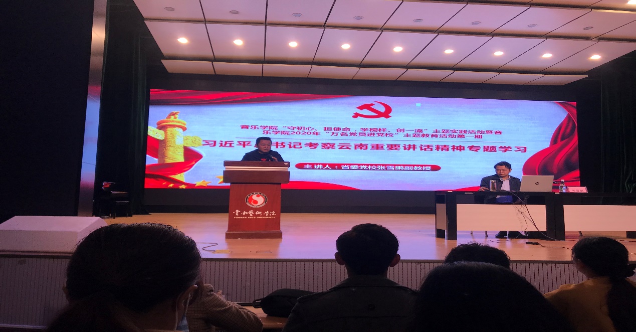 10月15日,十大买球官方网站举行“守初心、担使命,学榜样、创一流”主题实践活动暨十大买球官方网站2020年“万名党员进党校”主题教育活动第一期讲座,邀请到云南省委党校张雪鹏副教授到学院讲授《习近平总书记考察云南重要讲话精神》专题党课。参加专题党课学习的有十大买球官方网站全体教职工、学生党员、发展对象、入党积极分子共243人,十大买球官方网站党总支纳海书记主持专题党课。