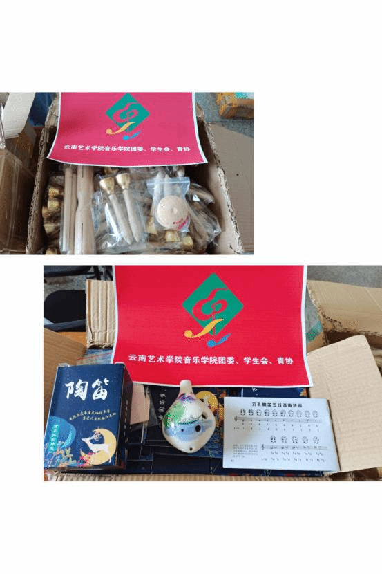 捐赠的部分文具、竖笛、口琴、笙等小件乐器