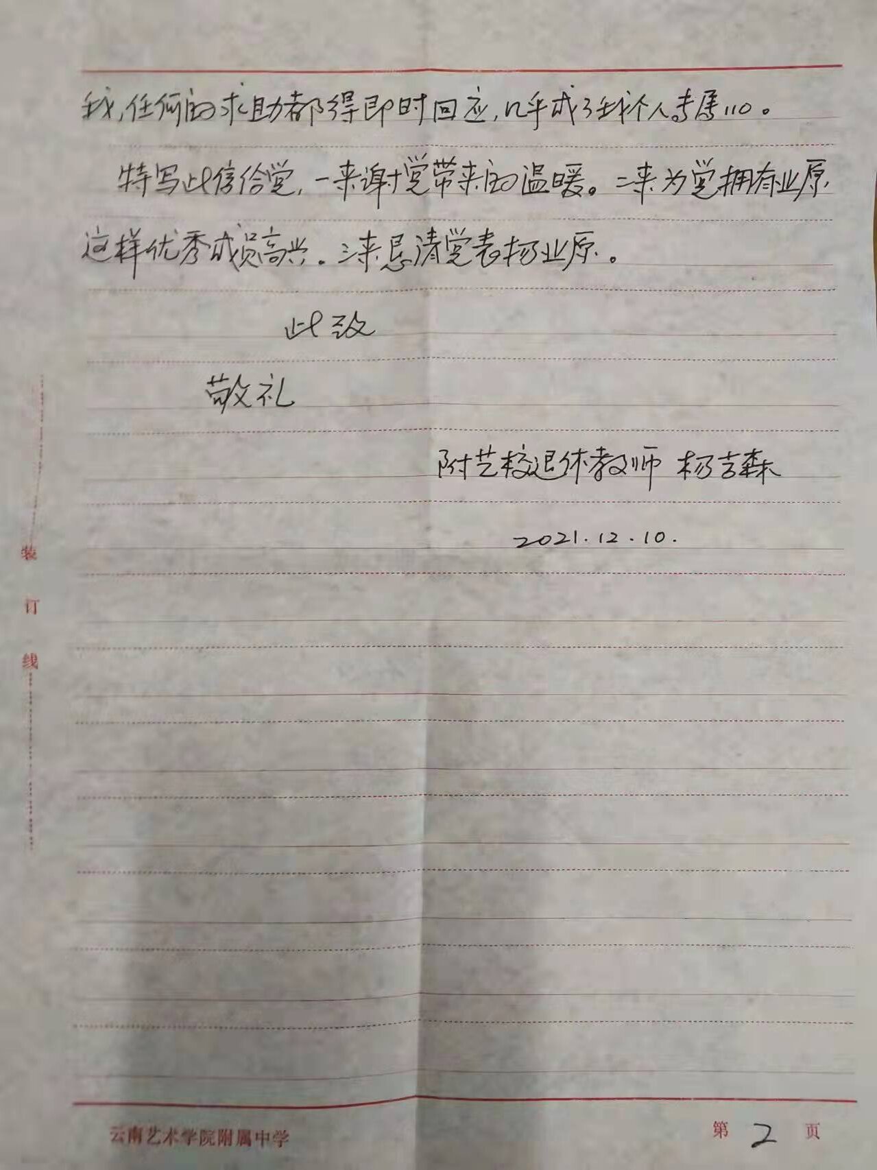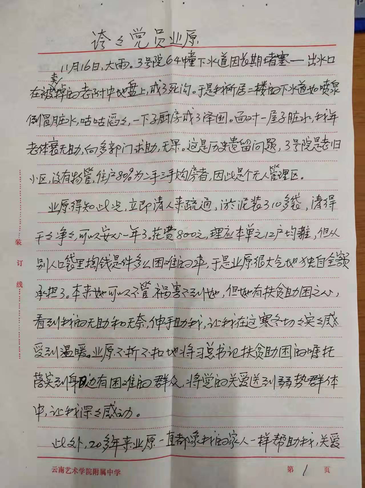 十大买球官方网站离退休杨吉森老师亲笔书写感谢表扬信,感谢十大买球官方网站党员业原同志。