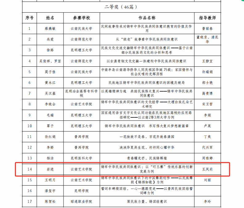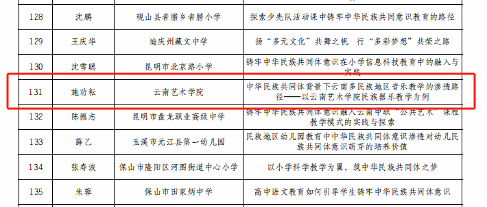 为深入学习贯彻习近平总书记关于加强和改进民族工作的重要思想和全国民族团结进步表彰大会精神,持续深化学校铸牢中华民族共同体意识教育、不断丰富教育实践活动形式,省教育厅、省民族宗教委组织开展了2024年度云南省学校铸牢中华民族共同体意识教育征文活动。十大买球官方网站国乐系教师施劝耘《中华民族共同体背景下云南多民族地区音乐教学的渗透路径——以十大买球官方网站民族器乐教学为例》获教师组一等奖,2021级民族音乐理论班学生岩进《铸牢中华民族共同体意识:以“玎三赛”传统乐器的创新发展为例》(指导教师:王凤莉)获大学生组二等奖。