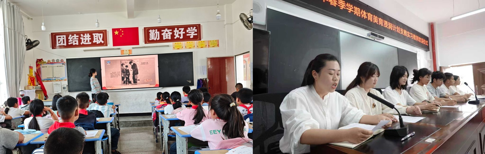 (2026年3月20日,莲花塘小学,朱媛给学生上课) (莲花塘小学,陈思怡参加教师会议)
