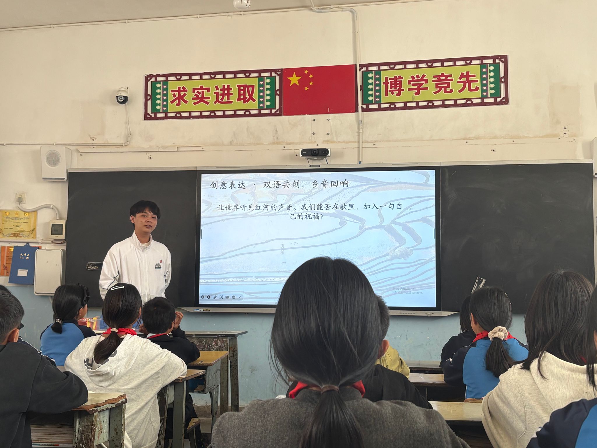 在浪堤镇中心完小,马礼翱为六年级学生开设《明天会更好》双语传唱课。课堂紧扣歌曲呼唤和平、传递希望、向善向美的思政内核,以红河梯田、本土村寨等学生朝夕相伴的家乡场景为切入点,快速搭建起经典作品与乡土情感的联结桥梁。教学中,马礼翱在完成歌曲演唱教学、突破弱起、切分节奏等演唱难点的基础上,创新设置本土化创意实践环节,引导学生将哈尼族、彝族母语及方言祝福融入经典旋律,通过师生共创完成乡音与经典的融合演绎,让学生在温暖传唱中感悟音乐跨越山海的大爱力量,在本土乡音的自信表达中筑牢民族文化自信。