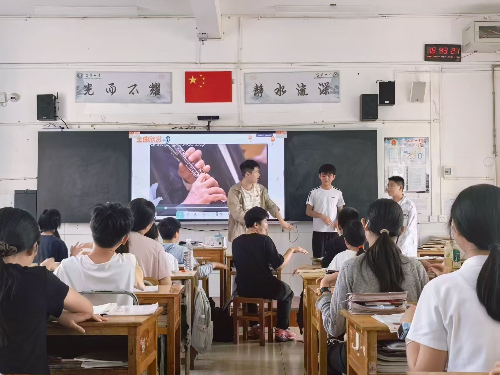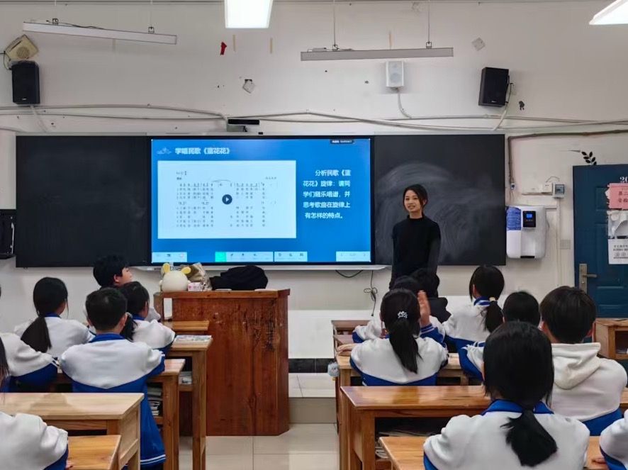 经过一周的充分准备,十名支教学生正式走上讲台。从《强军战歌》《但愿人长久》《采菱》等歌曲的教唱,到节奏律动的游戏互动,再到民族民间音乐的欣赏,课堂上歌声不断、笑声连连。面对不同学段的学生,支教学生灵活调整教学方法,努力让每一节音乐课都成为孩子们向往的快乐时光,让孩子们在动手实践中感受节奏的魅力。三尺讲台上,青春的激情与美育的温度交织融汇,音乐在课堂中流动,美在孩子们心中悄然扎根。