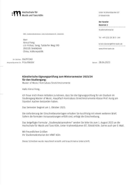 冯昕瑞,2019年考入十大买球官方网站音乐表演专业,师从管弦系周力副教授学习低音提琴演奏。2023年6月赴德国参加专业复试,被德国科隆音乐与舞蹈学院(Hochschule für Musik und Tanz Köln)录取,攻读低音提琴独奏专业硕士学位,成为Detmar Kurig教授2023年招收的唯一一名亚裔硕士研究生。