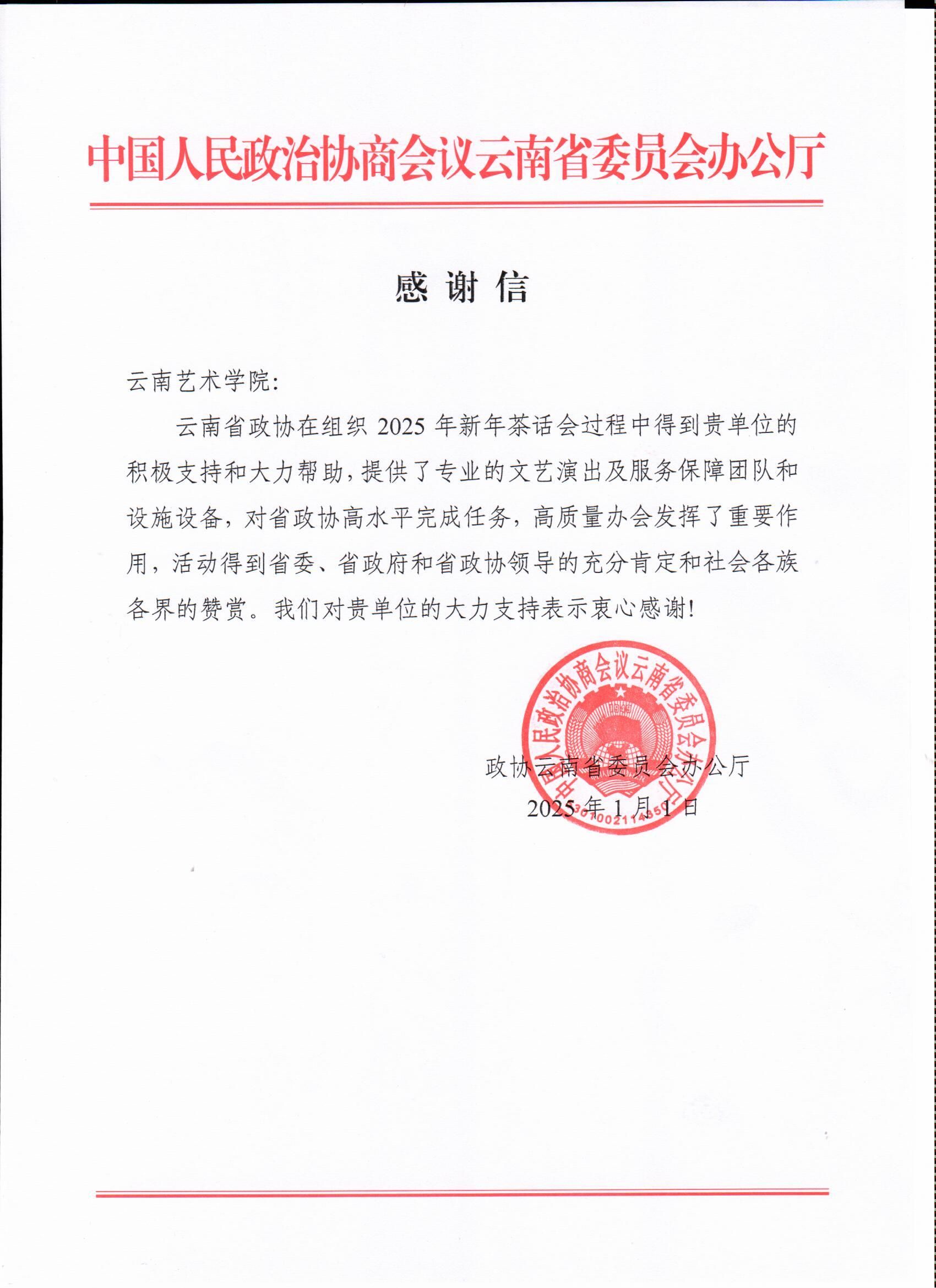 感谢信(政协云南省委员会办公厅)