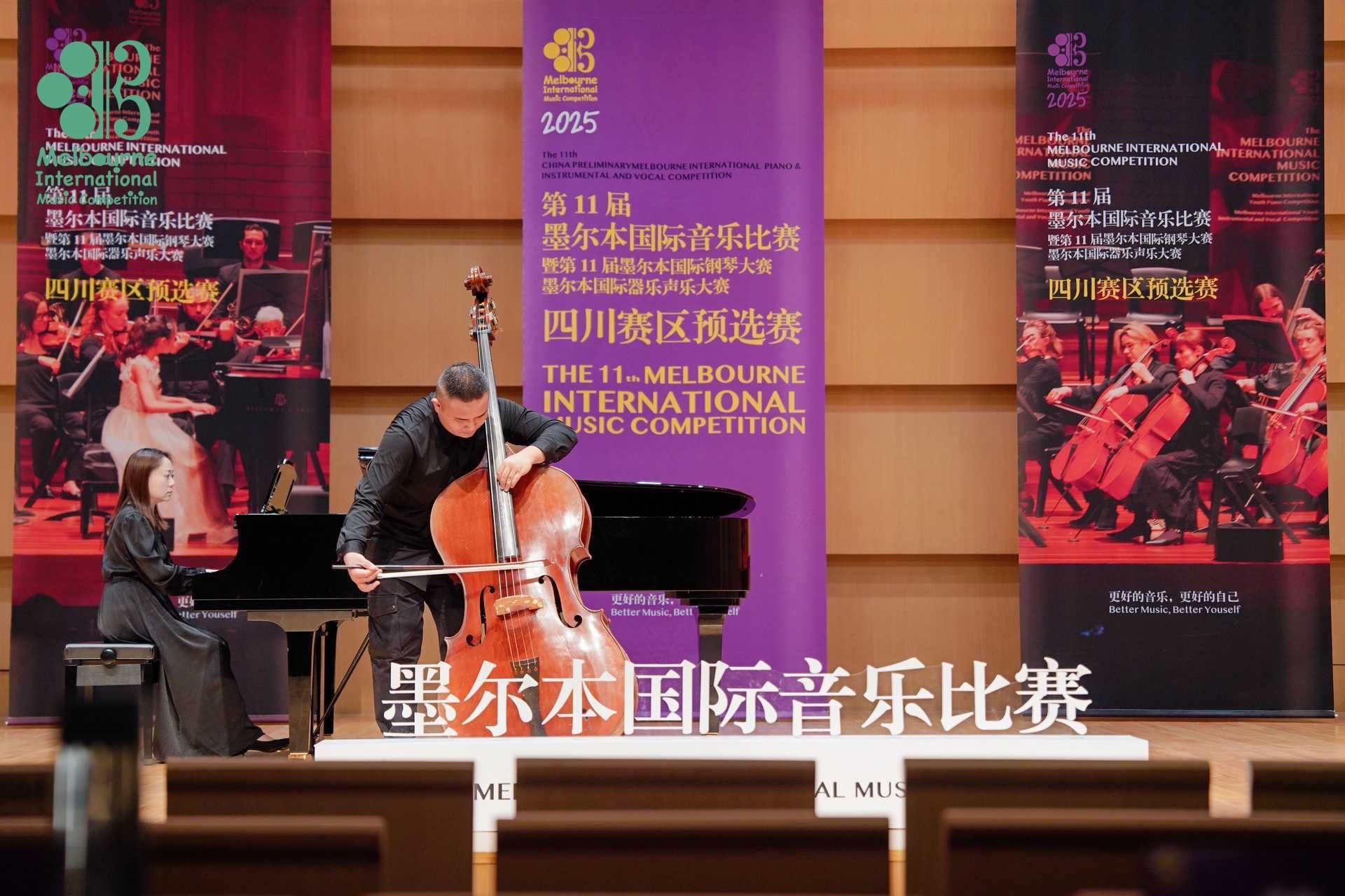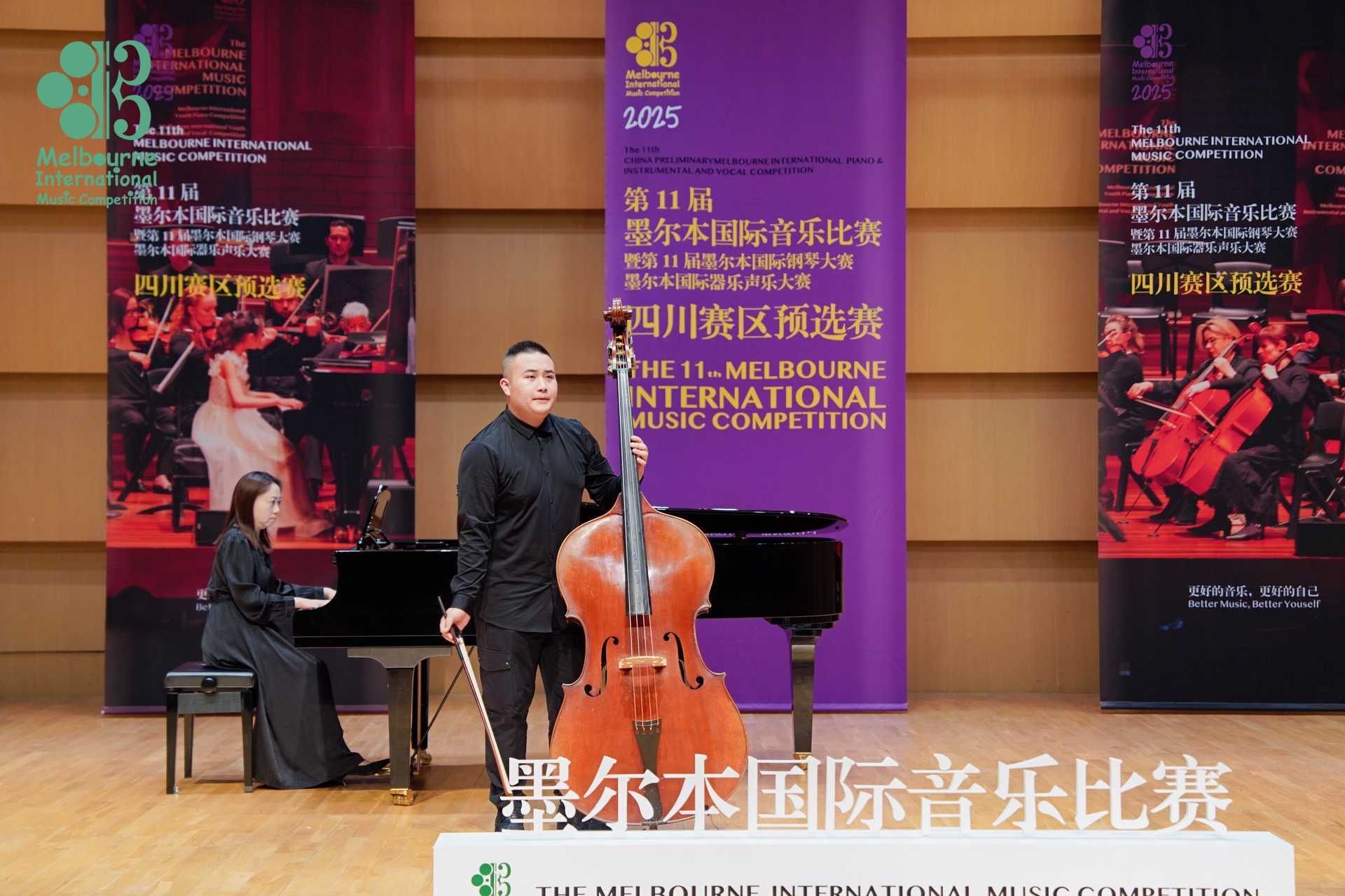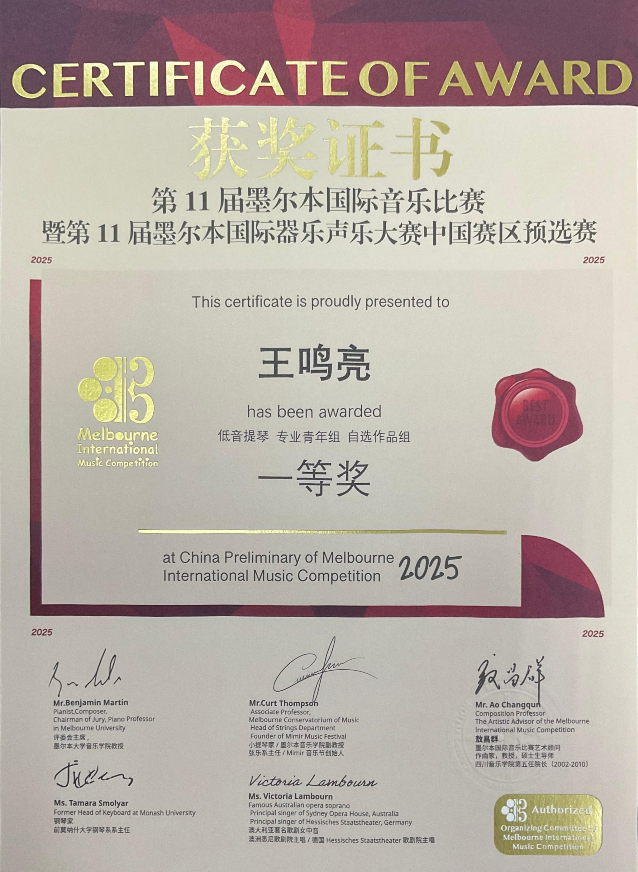 2025年4月26日至5月1日,在成都城市音乐厅举办的第11届墨尔本国际音乐比赛暨第11届墨尔本国际器乐声乐大赛中国赛区预选赛中,十大买球官方网站2022级管弦打击乐演奏班学生王鸣亮(2025年获评十大买球官方网站第五届“拔尖创新人才”)获低音提琴专业青年组自选作品组一等奖,并获得前往墨尔本莫纳什大学音乐厅参加全球决赛和研学资格。指导教师周力副教授获精英教师奖。
