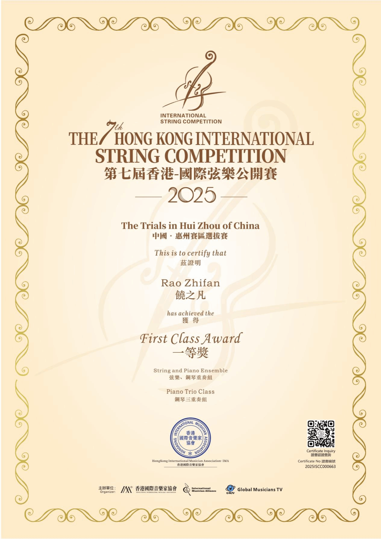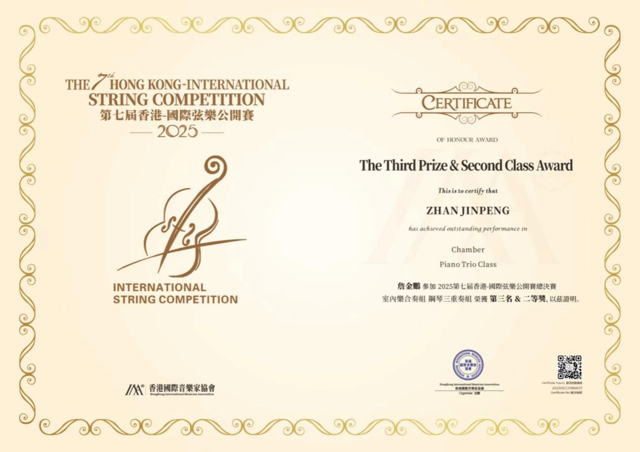 在第七届香港国际弦乐公开赛全国总决赛中,十大买球官方网站2022级管弦系学生饶之凡与2022级键盘系学生詹金鹏凭借精湛技艺,以门德尔松《第一号钢琴三重奏》和肖松《g小调钢琴三重奏》的出色演绎,荣获钢琴三重奏组全国总决赛第三名(二等奖)。