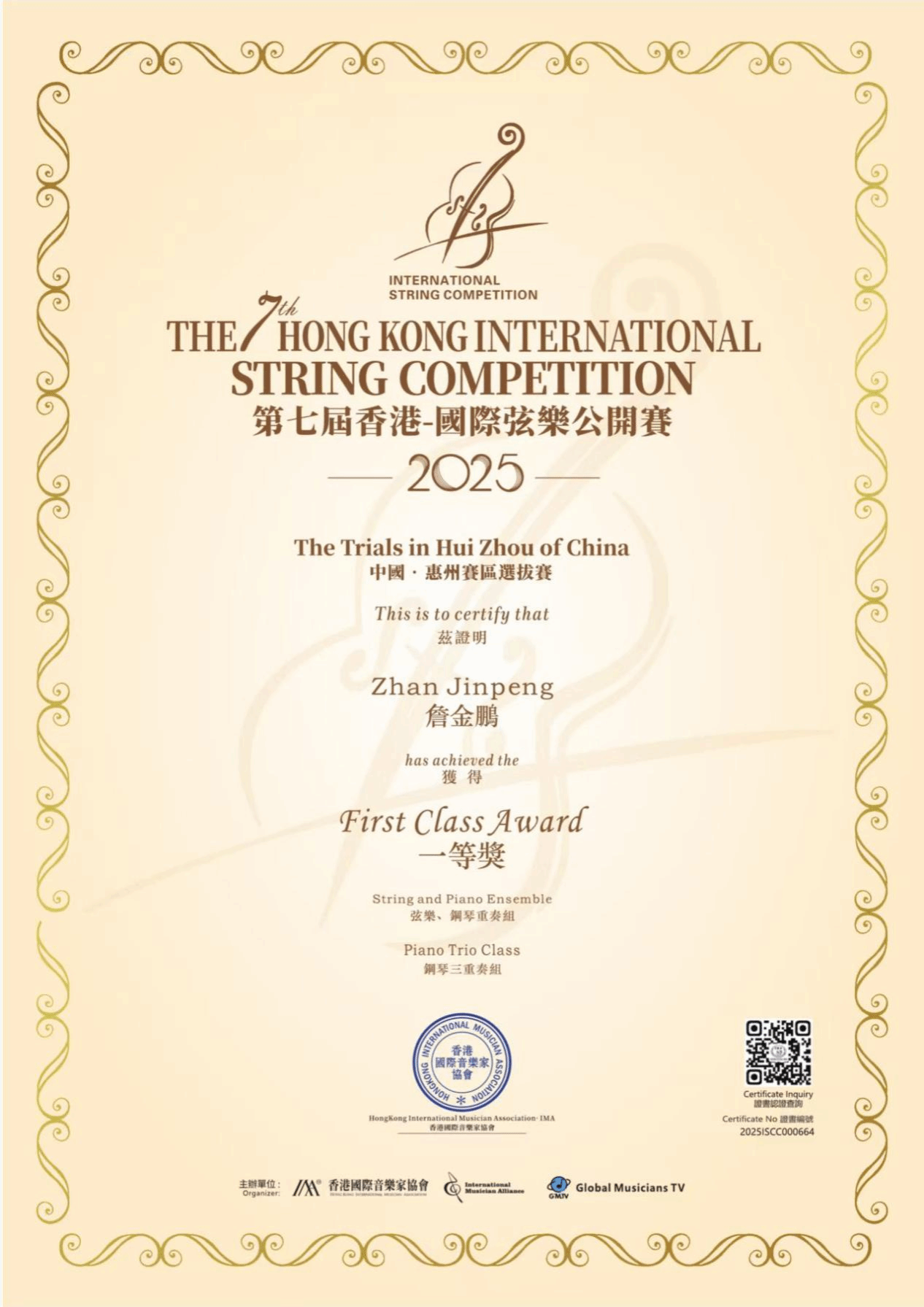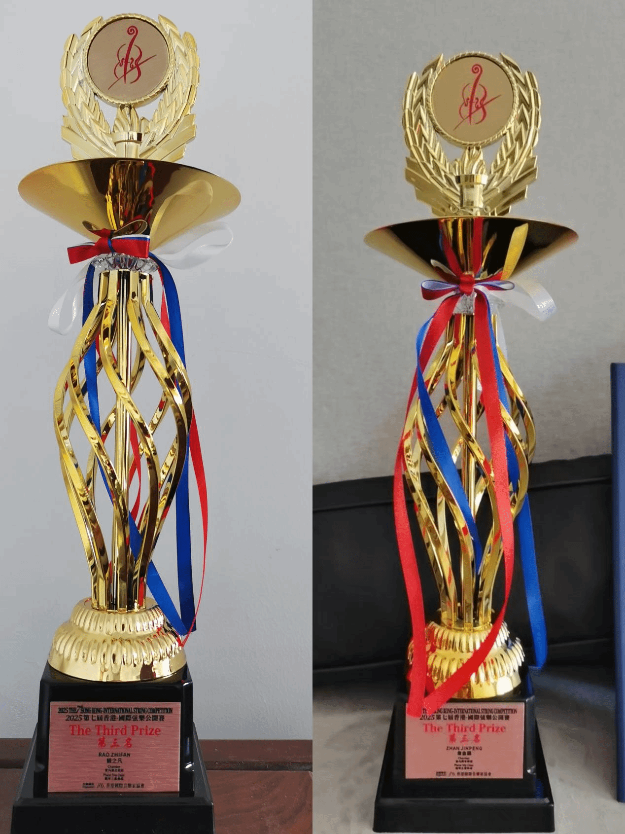 今年5月,在惠州赛区选拔赛中,两位同学以贝多芬《降B大调第四钢琴三重奏》第一乐章和德沃夏克《杜姆卡》第一乐章的优秀表现夺得赛区一等奖,顺利晋级全国总决赛。在备赛过程中,涂宇宏老师在弦乐演奏技法上给予专业指导,杨杨老师和谢青老师在钢琴声部处理和重奏配合方面倾心指导,三位老师通力合作,为同学们提供了全方位的艺术指导。在7月举行的全国总决赛中,两位同学在老师们的悉心指导下发挥出色,最终斩获全国第三名的优异成绩。