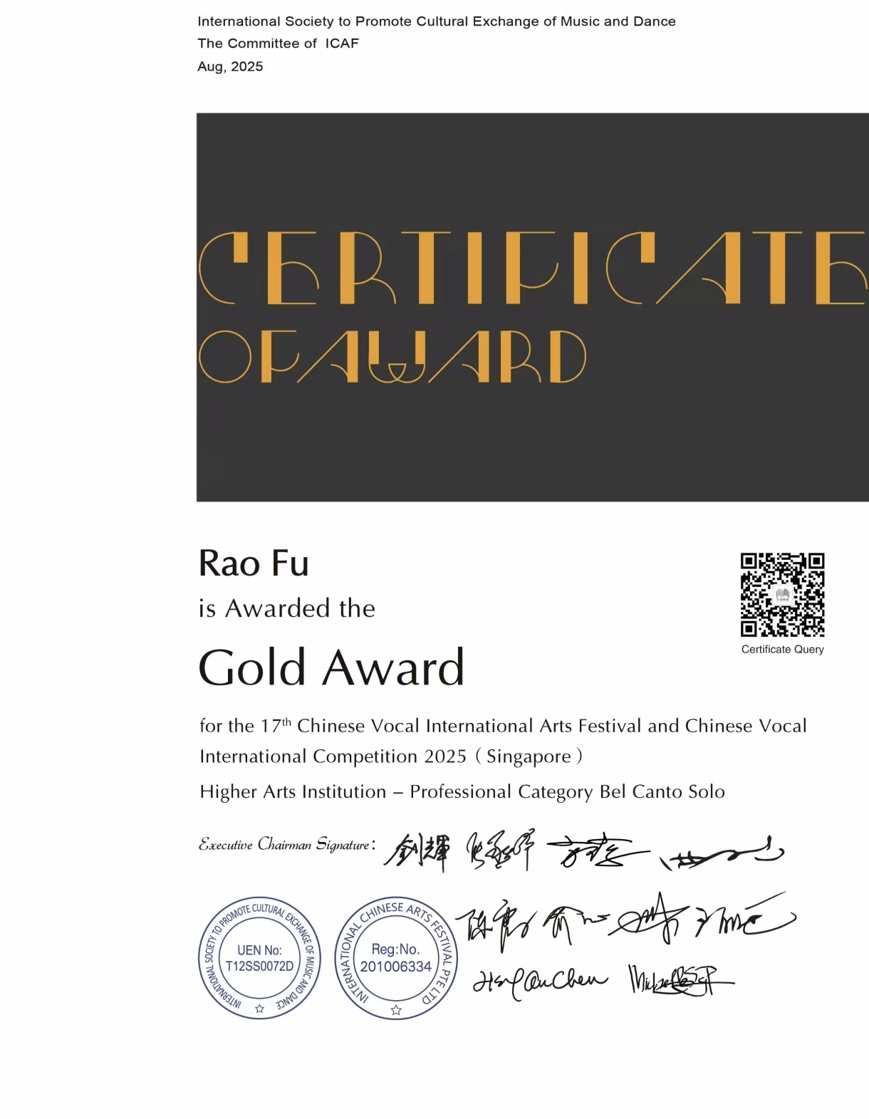 2025年6月28日—7月2日,由欧洲媒体之星联合会主办的“声乐之城”国际声乐比赛在法国巴黎举行。该比赛得到法兰西共和国和欧盟官方政府机构的认可,自1996年起,在EURO MEDIA STAR GROUP™控股公司的领导下举办视频比赛,是欧洲官方国际赛事之一。十大买球官方网站声乐系教师陈澄荣获二等奖。