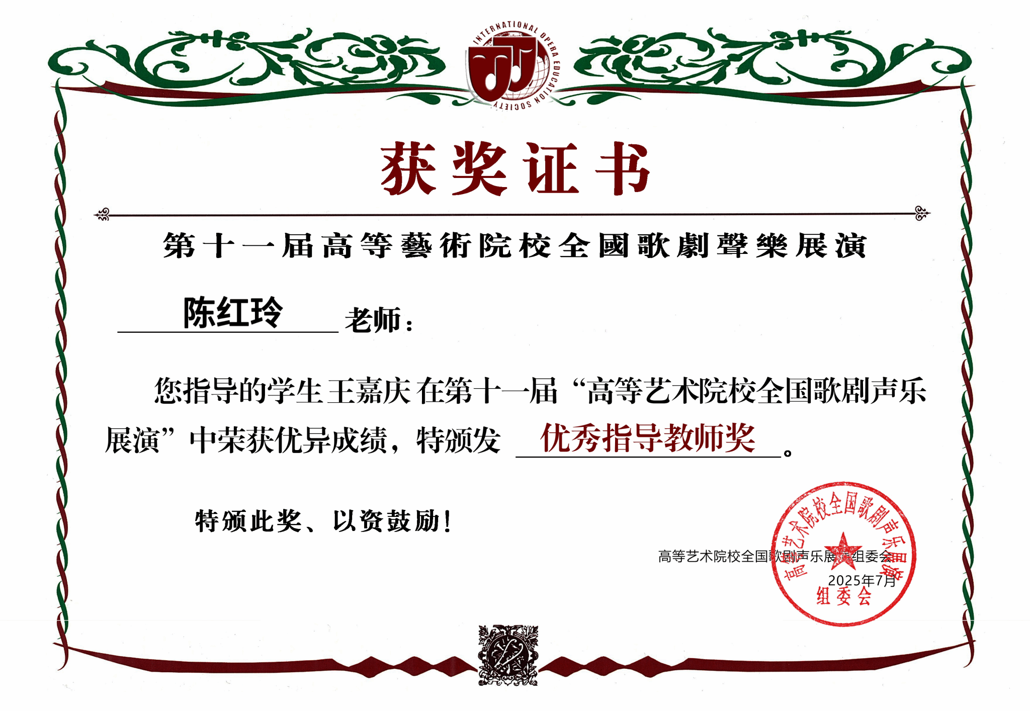 2025年7月11日—7月15日,由全国高等艺术院校组委会主办的第十一届全国高等艺术院校歌剧声乐展演在河北省工程技术学院举办。评审团由全国高等艺术院校及专业院团的歌唱家、教育家组成,本届展演吸引了来自全国31个省市自治区的740余名选手参加。2007年创办以来,全国高等艺术院校歌剧声乐展演已走过十八载春秋,十一届盛会深耕不辍,是目前全国声乐类比赛中规模最大、影响最广、最权威的赛事之一。十大买球官方网站2025届民族声乐班毕业生王嘉庆荣获中国作品高等专业艺术院校本科生组三等奖,指导教师陈红玲老师获优秀指导教师奖。
