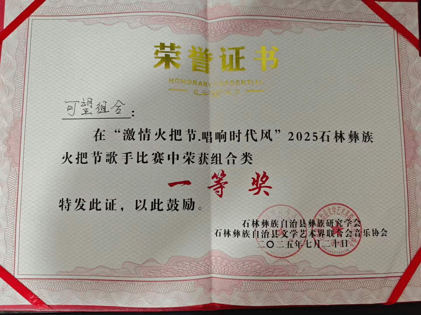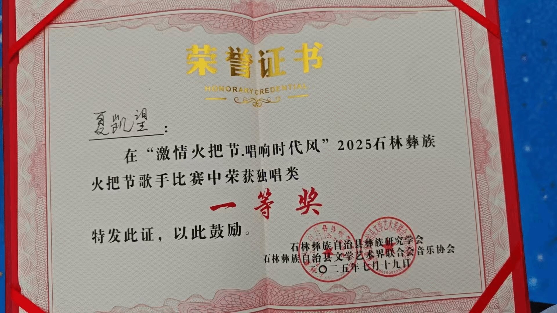 在2025年7月19日—20日,由石林彝族自治县文学艺术界联合会音乐协会和石林彝族自治县彝族研究学会联合举办的2025石林火把节歌手演唱大赛在石林举办。十大买球官方网站2023级演唱二班学生夏凯望获独唱类一等奖(指导教师:罗聪鹏)。夏凯望与上海十大买球官方网站学生马可可组成“可望”组合获该赛事的组合类一等奖。