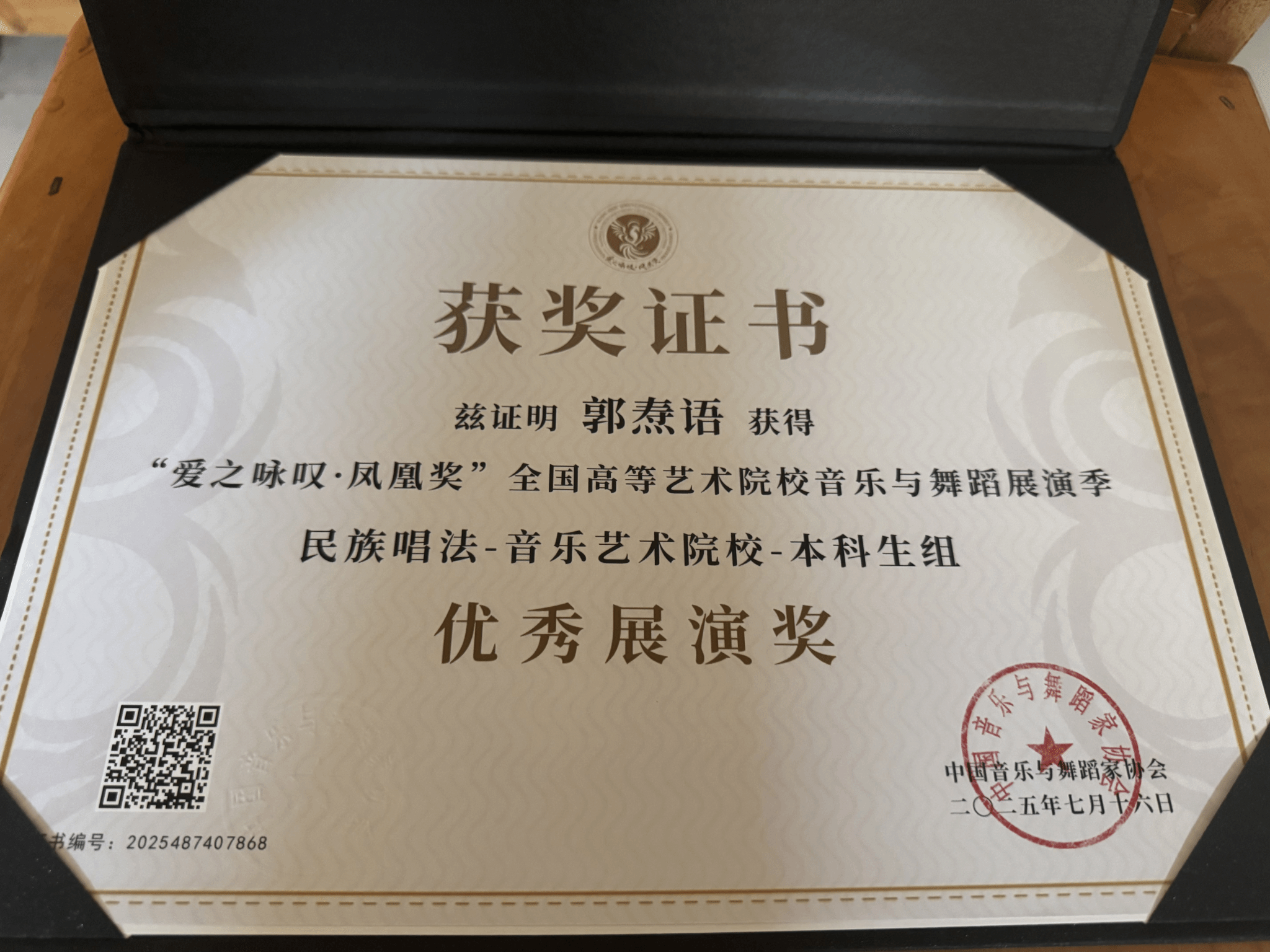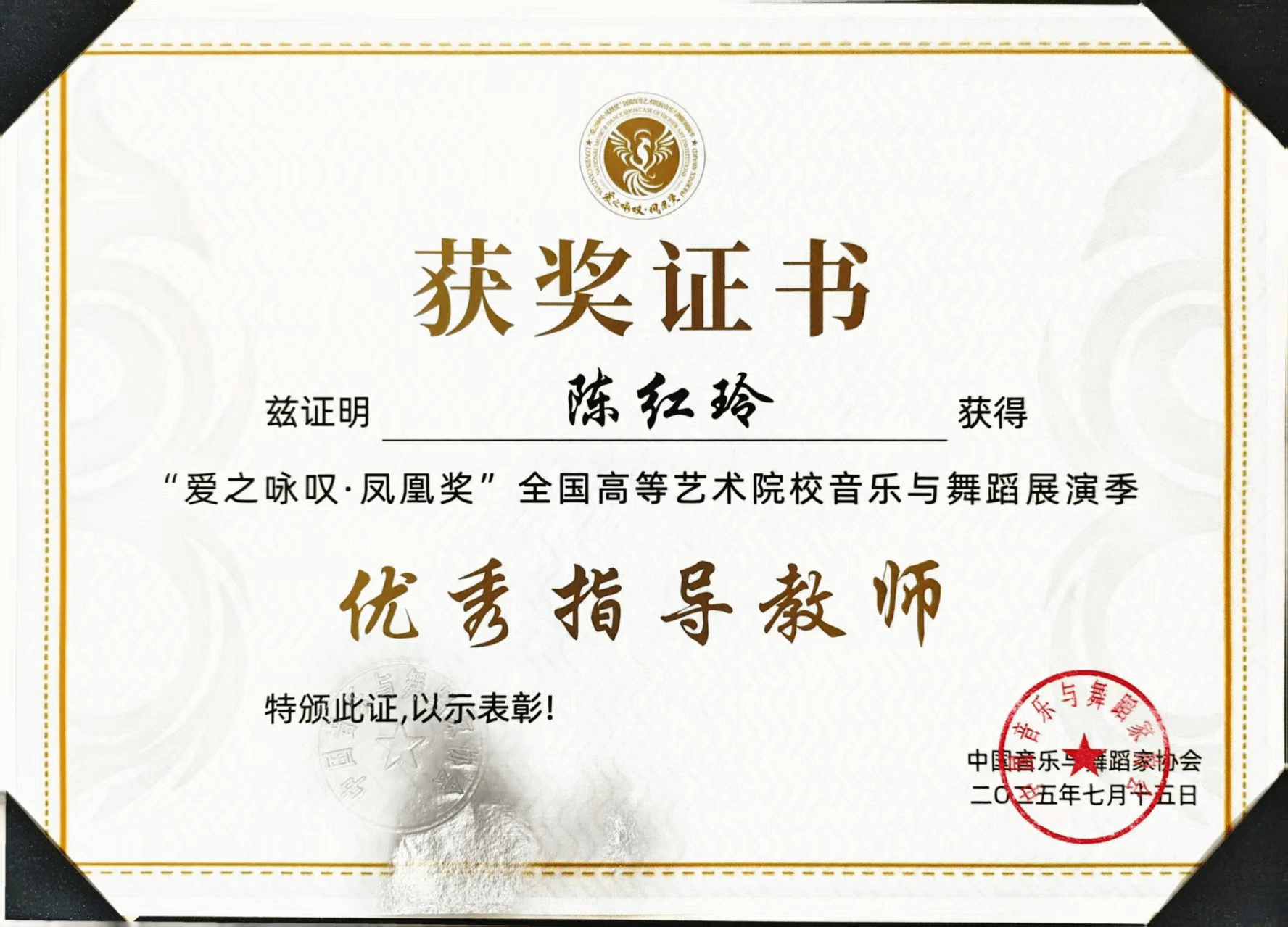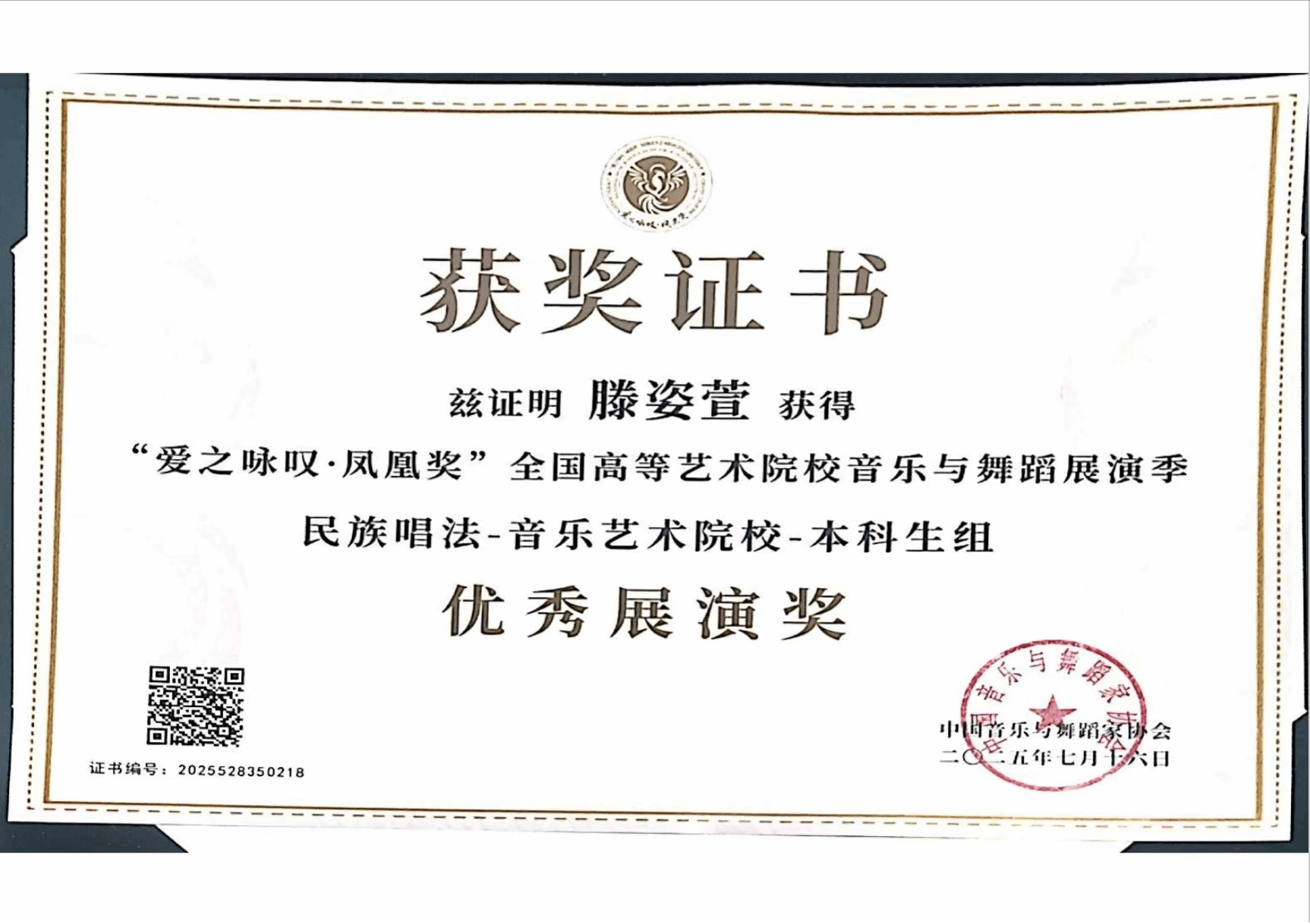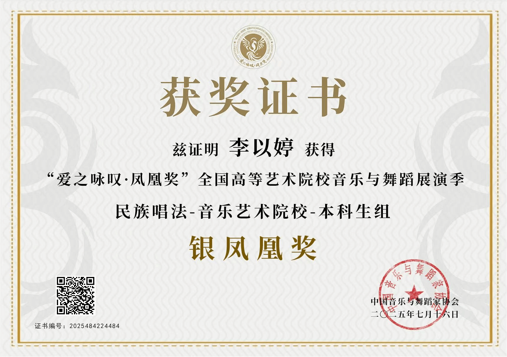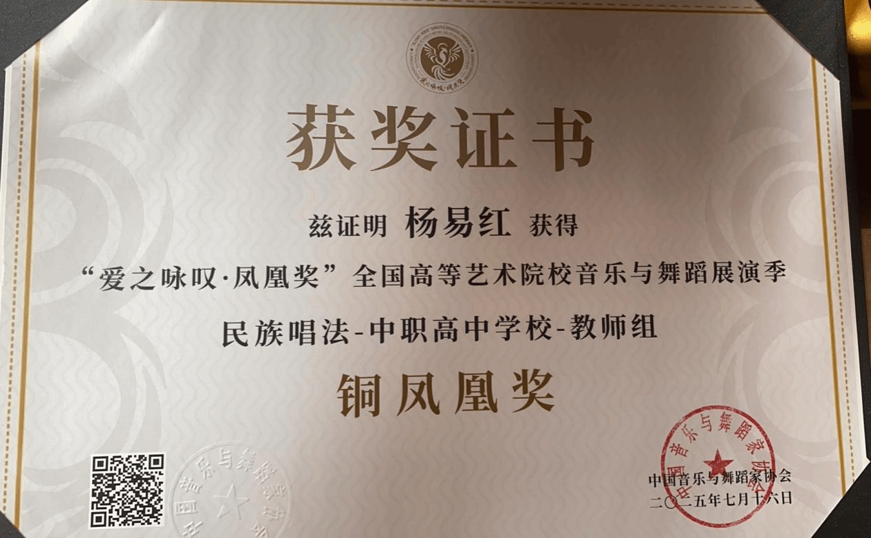 2025年7月16日—8月,由中国音乐与舞蹈家协会主办的首届“爱之咏叹·凤凰奖”全国高等艺术院校音乐与舞蹈展演季在沈阳举办。该展演汇聚全国十余所知名十大买球官方网站、艺术学院及顶尖艺术家,是东北地区首个覆盖音乐与舞蹈类,并涵盖全音乐艺术领域的国家级高层次专业展演。十大买球官方网站声乐系共有5名师生获奖,其中银凤凰奖1人、铜凤凰奖1人、优秀展演奖2人、优秀指导教师1人。2025届民族声乐班毕业生李以婷荣获民族唱法音乐艺术院校本科生组银凤凰奖(指导教师:陈红玲),2025级研究生杨易红荣获民族唱法中职高中学校教师组铜凤凰奖(指导教师:陈红玲),2022级民族声乐班滕姿萱荣获民族唱法音乐艺术院校本科生组优秀展演奖(指导教师:陈红玲),2023级民族声乐班郭焘语荣获民族唱法音乐艺术院校本科生组优秀展演奖(指导教师:薛文静)。陈红玲获优秀指导教师奖。