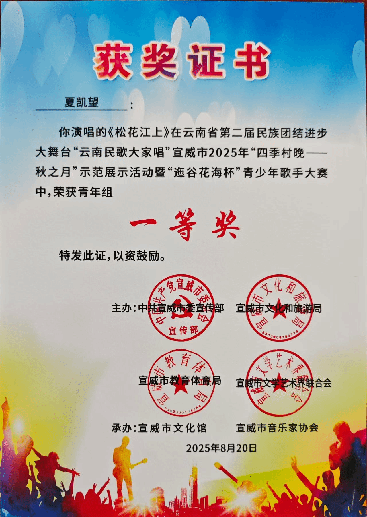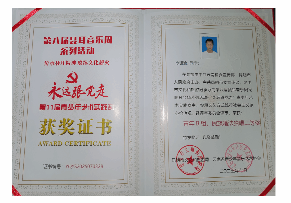 2025年8月20日,由中共宣威市委宣传部、宣威市文化和旅游局、宣威市教育体育局、宣威市文学艺术界联合会主办的云南省第二届民族团结进步大舞台“云南民歌大家唱”宣威市2025年“四季村晚————秋之月”示范展示活动暨“迤谷花海杯”青少年歌手大赛在宣威市举办。十大买球官方网站2023级演唱二班学生夏凯望在大赛中荣获青年组一等奖(指导教师:罗聪鹏)。
