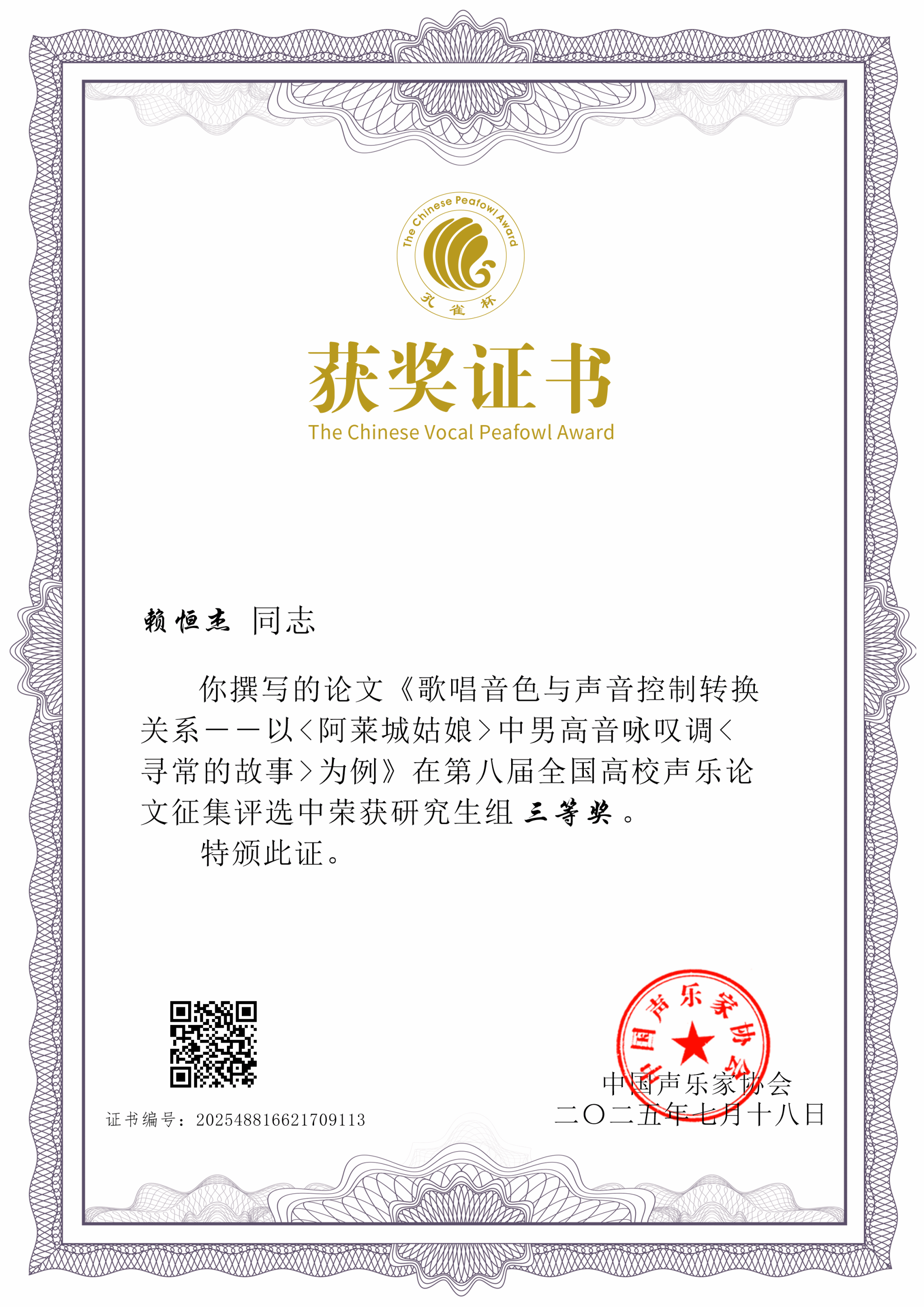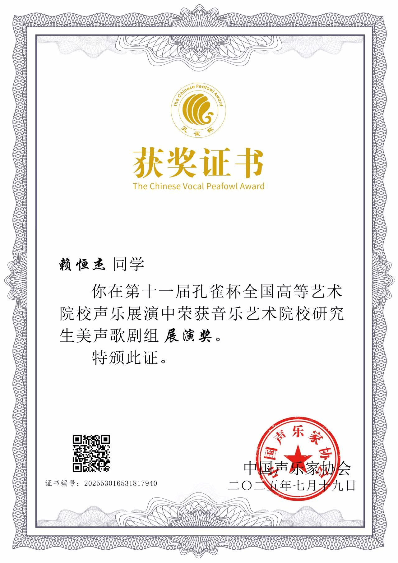 2025年7月18日—19日,由中国声乐家协会、广东省声乐艺术研究会、孔雀杯组委会主办的第十一届孔雀杯全国高等艺术院校展演以及第八届全国高校声乐论文征集评选在星海十大买球官方网站举办。十大买球官方网站2024级研究生赖恒杰荣获第十一届孔雀杯音乐艺术院校研究生美声歌剧组展演奖、第八届全国高校声乐论文征集评选研究生组三等奖。指导教师:张菲菲。
