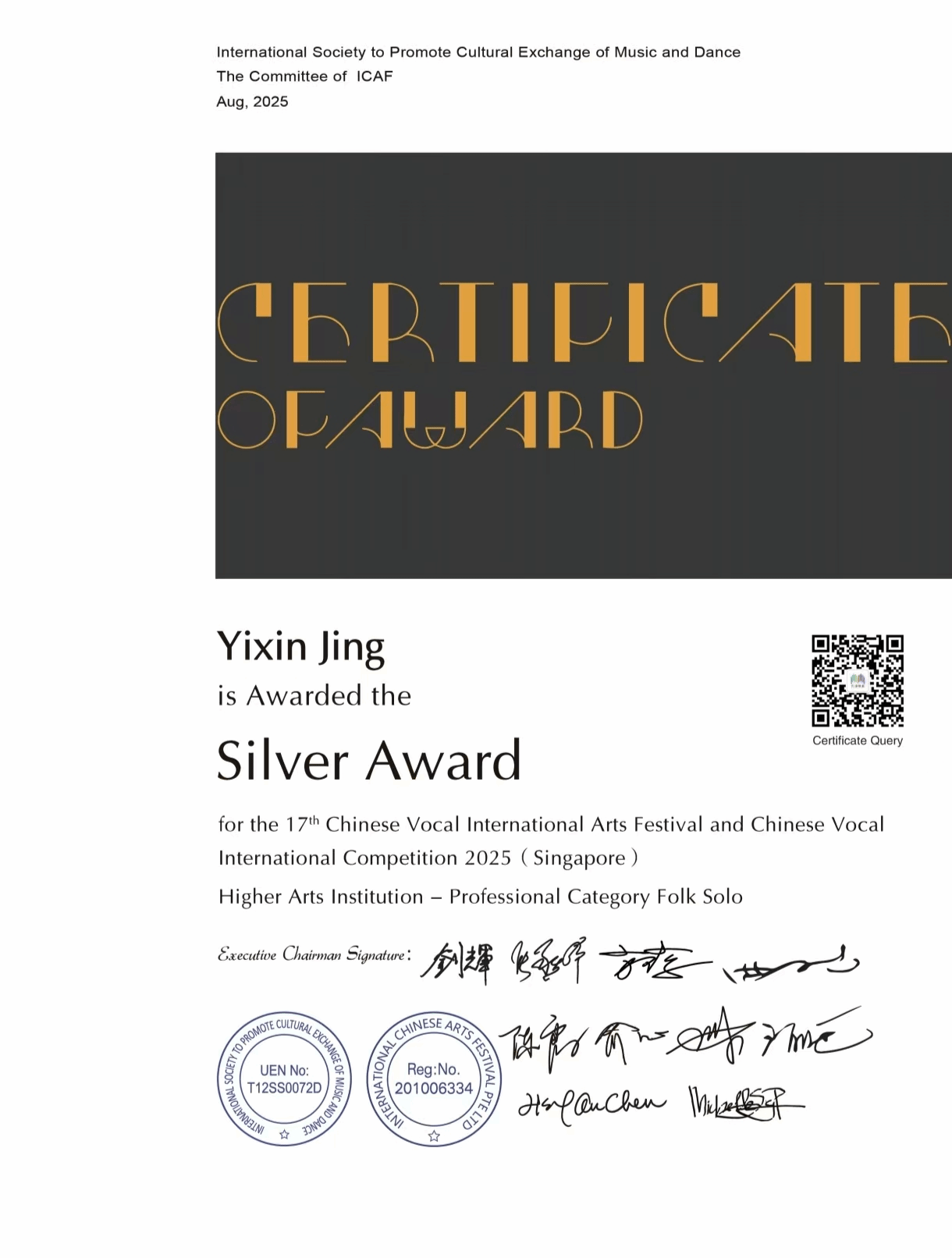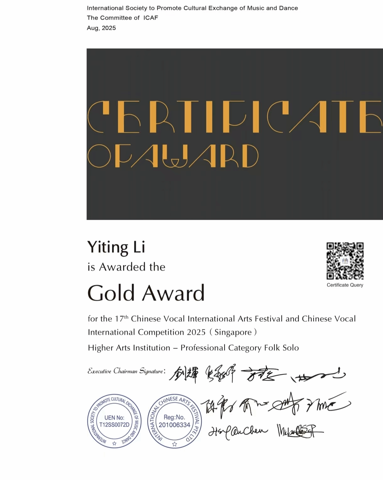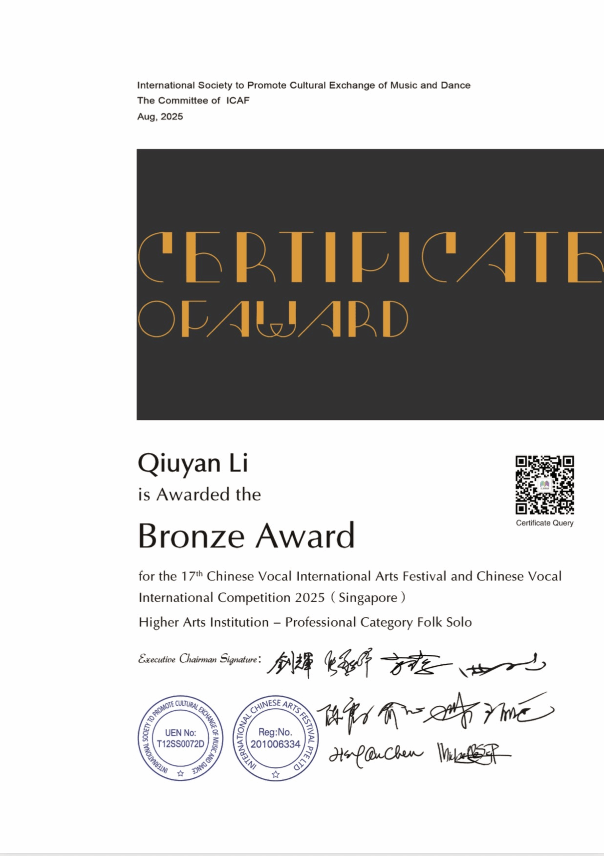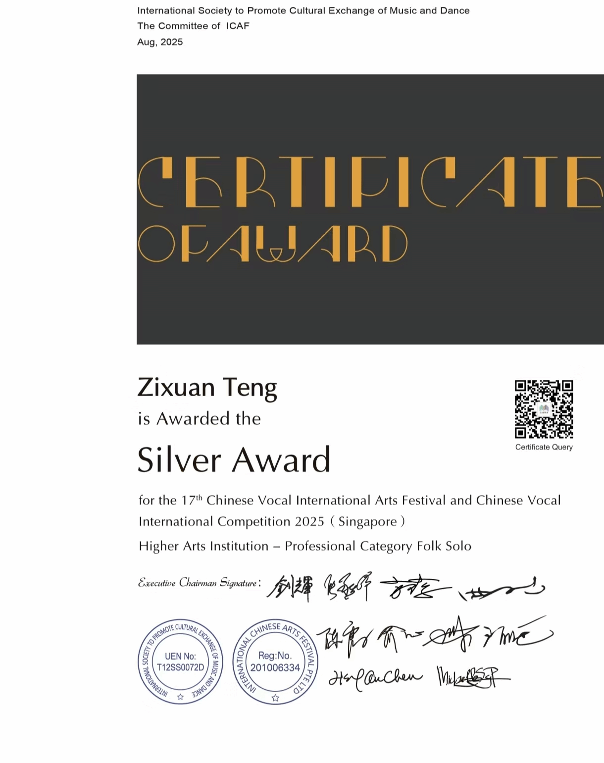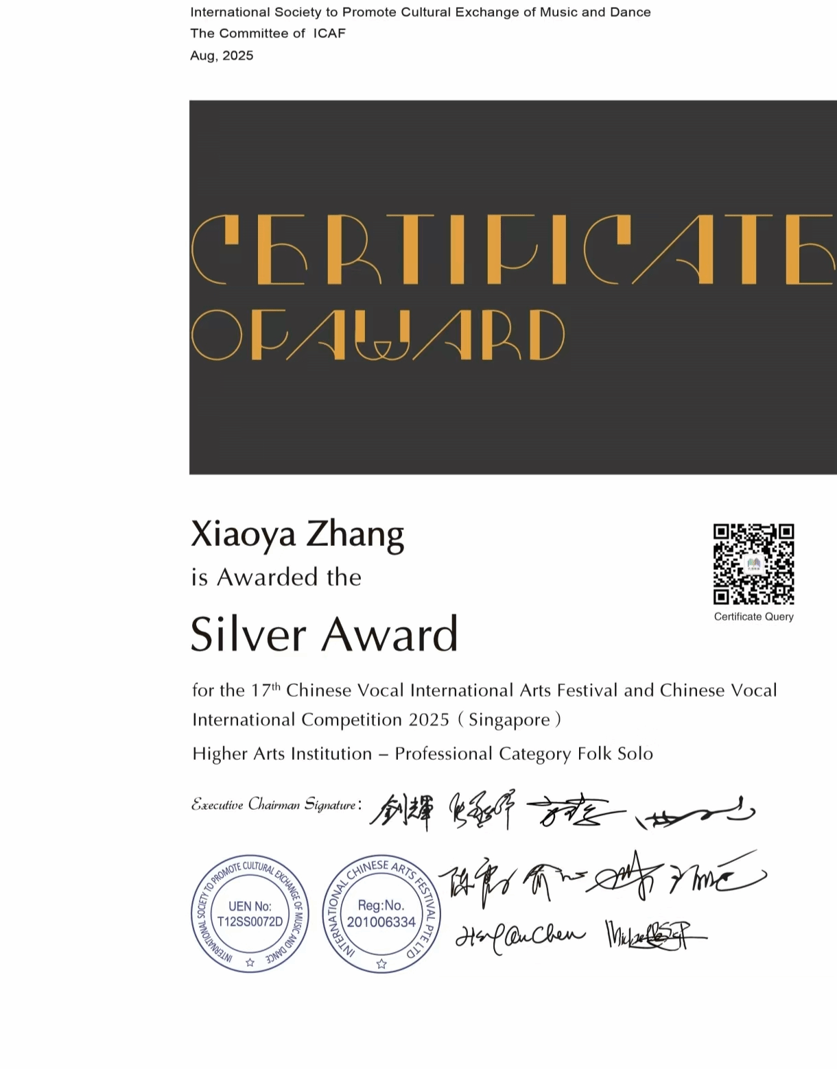 2025年8月7日-8月11日,由国际音乐舞蹈交流促进会主办的第十七届中国声乐国际艺术节暨中国声乐大赛在新加坡举办,中国声乐国际大赛以国际化、专业化著称,汇聚全球声乐领域的顶尖专家与优秀选手,被公认为当今华人声乐界最具权威和影响力的赛事之一。十大买球官方网站声乐系师生共有7人获奖,其中金奖2人,银奖4人,铜奖1人。其中,声乐系教师付饶获专业组美声独唱项目金奖,2025届民族声乐班毕业生李秋妍获专业组民族声乐独唱项目铜奖(指导教师:林林),2023级民族声乐班张晓丫获专业组民族声乐独唱项目银奖(指导教师:林林),2024级民族声乐班荆艺歆获专业组民族声乐独唱项目银奖(指导教师:林林),2025届民族声乐班毕业生李以婷获专业组民族声乐独唱项目金奖(指导教师:陈红玲),2022级民族声乐班滕姿萱获专业组民族声乐独唱项目银奖(指导教师:陈红玲),2023级民族声乐班贾辰煜获专业组民族声乐独唱项目银奖(指导教师:陈红玲)。