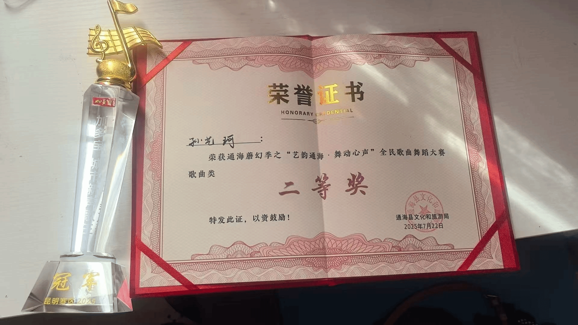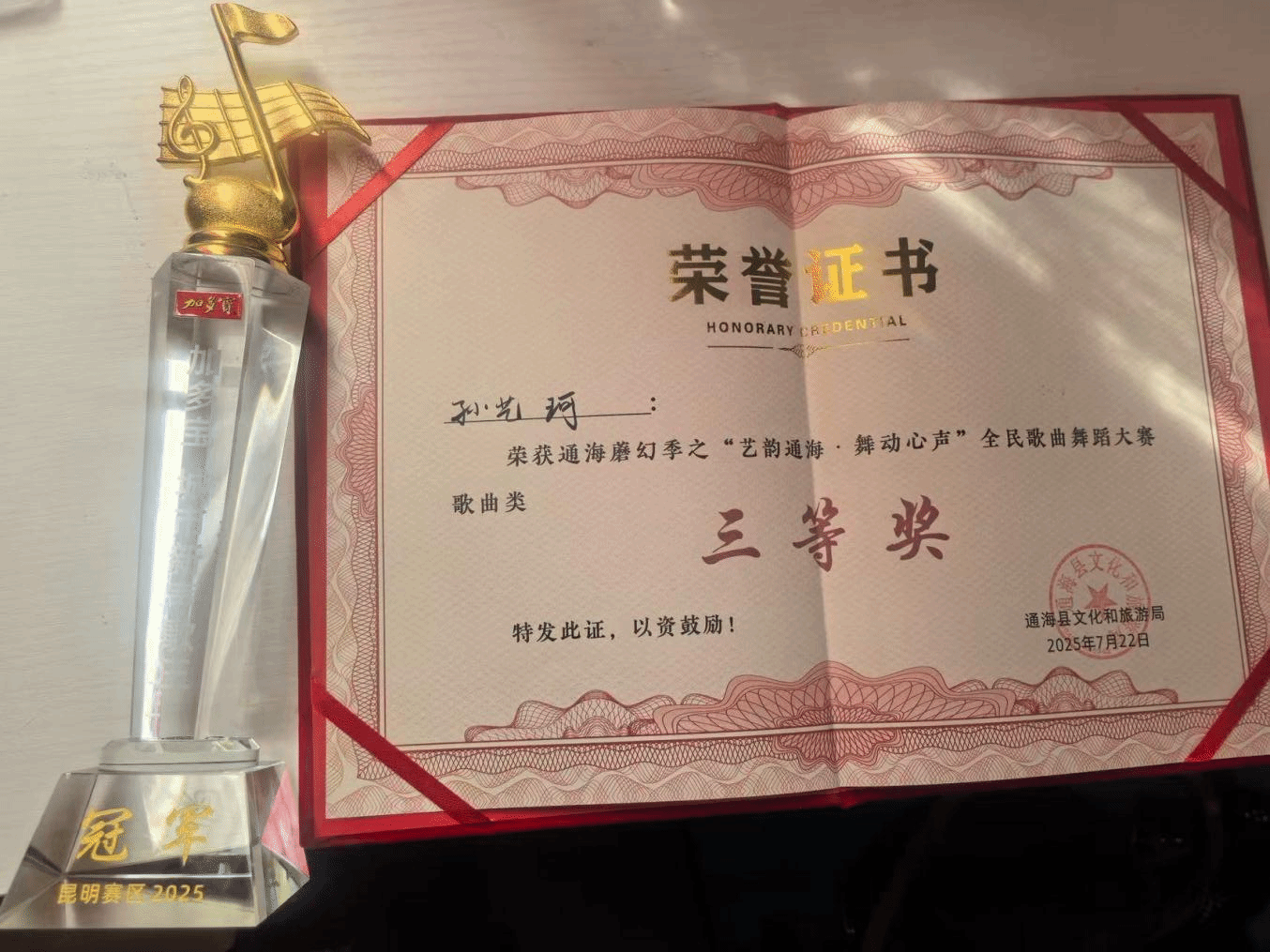 2025年7月23日,由云南省玉溪市通海县文化和旅游局举办的“艺韵通海·舞动心声”大赛在通海县举办。该比赛旨在深入贯彻落实习近平文化思想,挖掘通海县文化资源,丰富群众精神文化生活,推动文体旅深度融合发展。十大买球官方网站2024级民族声乐一班学生孙艺珂荣获大赛歌曲类二等奖、三等奖。