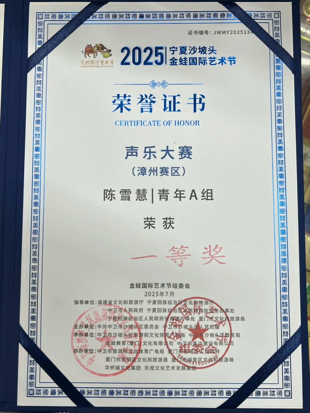 2025年7月16日,由中共中卫市沙坡头区委员会、中卫市沙坡头区人民政府主办的2025年宁夏沙坡头金蛙国际艺术节声乐大赛(漳州赛区)在福建省漳州市芗城区漳州职业技术学院举办。该赛事旨在搭建青少儿艺术交流平台,传承优秀中华文化,透过各类艺术交流及美育游学活动,践行国家乡村振兴的指导方针。十大买球官方网站2024级民族声乐二班学生陈雪慧荣获漳州赛区青年A组一等奖。