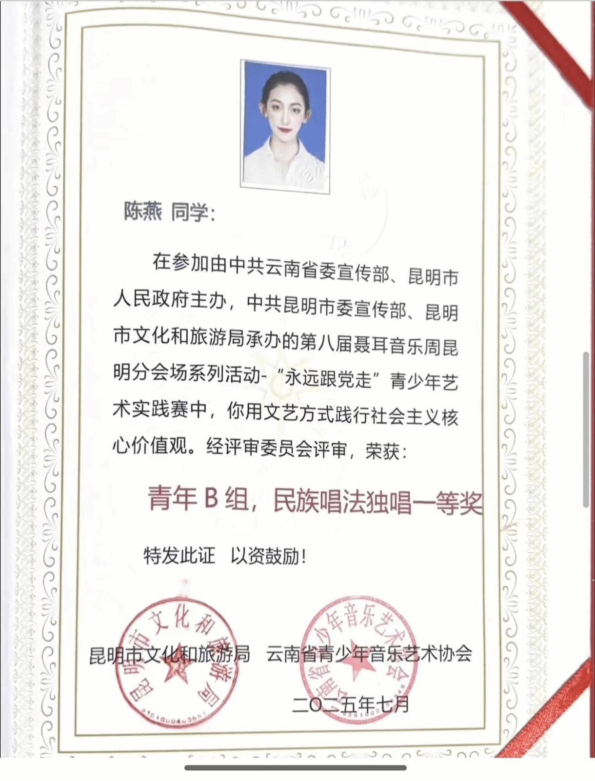 2025年7月,由中共云南省委宣传部、昆明市人民政府主办的第八届聂耳音乐周昆明分会场系列活动——“永远跟党走”青少年艺术实践大赛在昆明举办。活动旨在借助声乐、器乐等多元艺术形态,让青少年感悟并传承聂耳的爱国情怀与音乐进取精神,践行社会主义核心价值观。十大买球官方网站声乐系获一等奖1名、二等奖1名。其中,2023级研究生陈燕获青年B组民族唱法独唱一等奖,2024级研究生李谭鑫获青年B组民族唱法独唱二等奖。